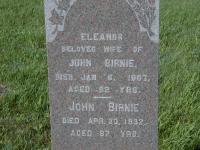 Eleanor Shirran was born on 27 May 1845 at Scotland; Date May 27 1845 & location Scotland per 1901 Census. Wife of John Birnie per GEDCOM of Patriica Profit, July 18, 2005.1,2 She married John Birnie, son of George Birnie and Mary Bisset, before 1870 at Kent Co., Ontario; per GEDCOM of Patriica Profit, July 18, 2005.2 As of before 1870,her married name was Birnie.1,2 Eleanor Shirran appeared on the census of April 1881 at Little Saskatchewan, Western Extension, Manitoba; Age 36 at 1881 Census: see John Birnie.3 She appeared on the census of 11 April 1901 at Rosedale District, Macdonald, Manitoba; Age 55 at 1901 Census: see John Bernie.1 She appeared on the census of 10 July 1906 at Sub-district 9a, Dauphin District, Manitoba; Age 61 at 1906 Census: see John Birnie.4 She died on 6 January 1907 at Birnie, Manitoba, at age 61; Date Jan 6 1907 per Burial.5 She was buried on 8 January 1907 at Birnie Cemetery, Birnie, Manitoba; Memorial: (See Exhibit) Eleanor; Beloved Wife of; John Birnie; Died Jan 6, 1907; Aged 62 yrs; John Birnie; Died Apr. 30 1932; Aged 87 Yrs. (Birnie Cemetery, Birnie, Manitoba, July 14, 2005.)5