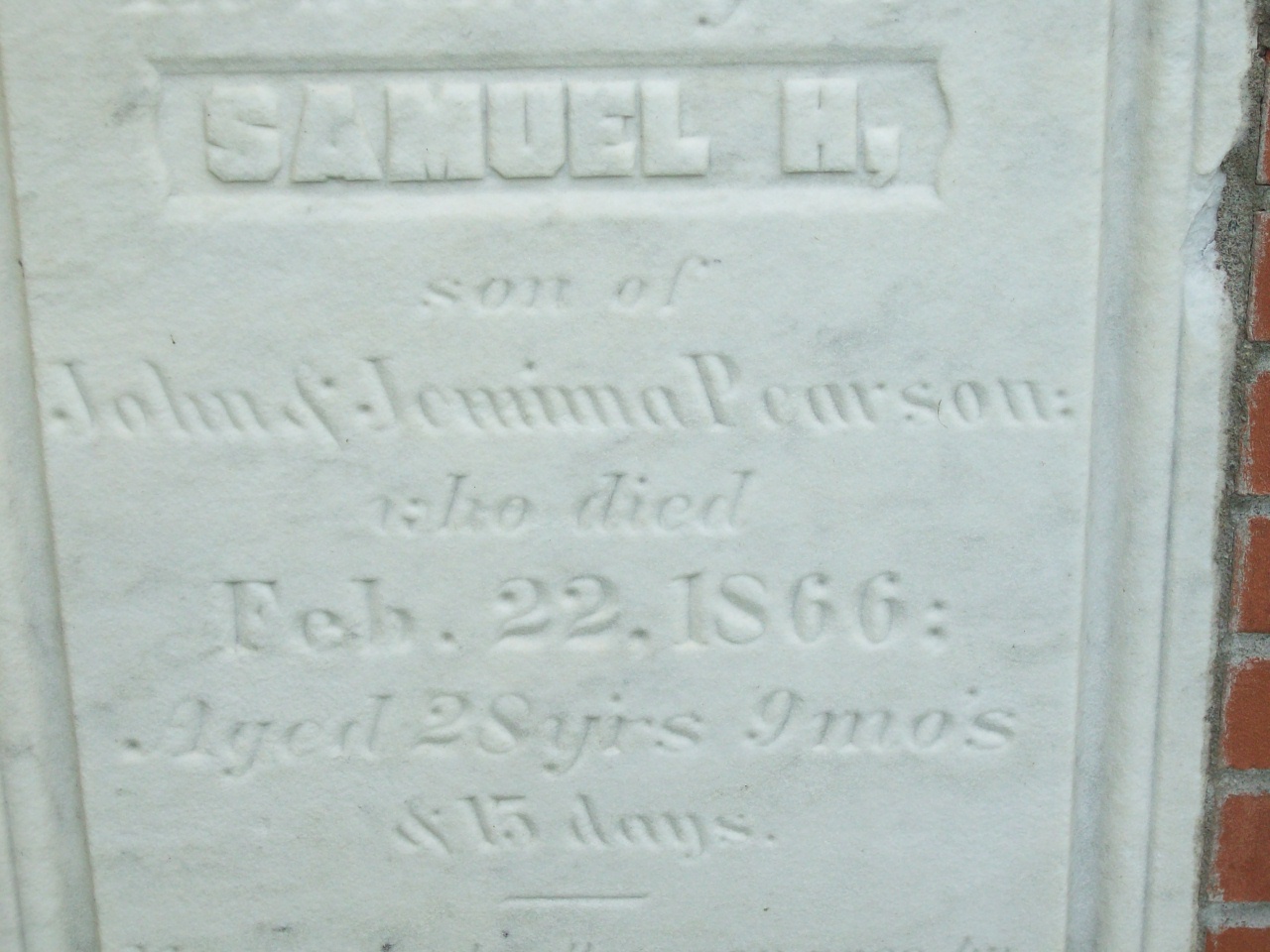 Samuel H. Pearson was born on 7 May 1837 at Ontario; Date May 7 1837 per Memorial - age 28y 9m 15d at death Feb 22 1866. Date 1837 per 1861 Census. Date 1838 per GEDCOM of John Maybee, Aug 3, 2005.1,2,3 He appeared on the census of April 1861 at Brighton Twp., Northumberland Co., Ontario; Age 24 at 1861 Census: see John Pearson.2 He died on 22 February 1866 at Ontario at age 28; Date Feb 22 1866 per Memorial.3 He was buried on 24 February 1866 at Wooler Friends Cemetery, Brighton Twp., Northumberland Co., Ontario; Memorial: (See Exhibit) Samuel H; son of; John & Jemima Pearson; who died; Feb. 22, 1866; aged 28 yrs. 9 mos; & 15 days (Wooler Friends Cemetery, Brighton Twp., June 30, 2008.)3