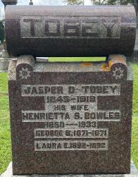 Cemetery Transcription: Jasper D. Tobey 1845-1918; His Wife Henrietta S. Bowles 1850-1933; George B. 1871-1871; Laura E. 1892-1892 (Hillcrest Cemetery, Tara, Lot 30, Conc 9 & 10, Arran Twp., Bruce Co., Plot 251 - Ontario Archives)