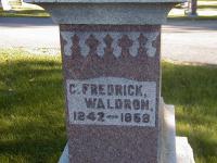 Charles Frederick Waldron was born in 1842 at Northumberland Co., Canada West; per IGI Record.1 He appeared on the census of 1852 at Murray Twp., Northumberland Co., Canada West; Age 9 at 1851 Census: see James S. Waldron.2 He appeared on the census of April 1861 at Murray Twp., Northumberland Co., Canada West; Age 19 at 1861 Census: see James Waldron.1 He was buried in 1868 at St. George's Cemetery, Trenton, Northumberland Co., Ontario; Memorial: (See Exhibit) C. Frederick; Waldron; 1842 - 1868 (St. George's Cemetery, Sep. 24, 2005.)3 He died in 1868 at Murray Twp., Northumberland Co., Ontario; Date 1868 per Burial.3