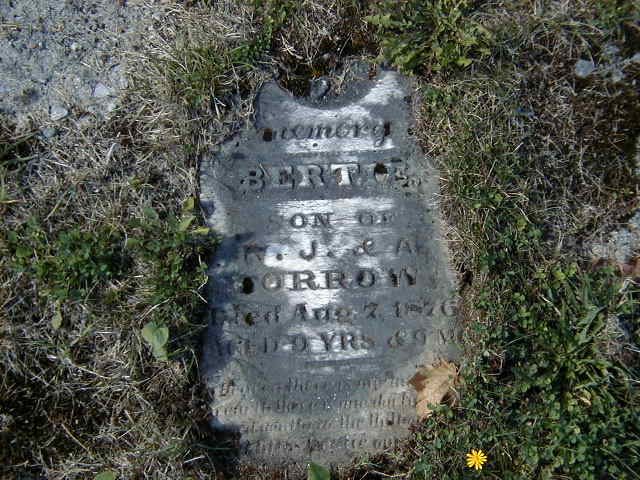 Bertie; Son of; R J & A ;Morrow; Died Aug 7 1876; Aged 9 yrs & 9 mo (Hilton Cemetery, Sep 26 2004.)1