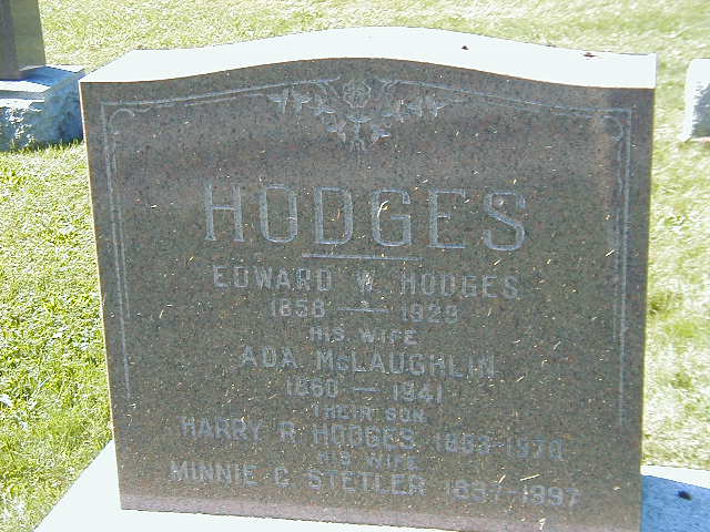 Minnie B. Stetler was born in 1897 at Norfolk Co., Ontario; Date 1897 per Burial. Date 1897 & location Ont. per 1931 Census. Date 1896 & location Norfolk Co. per marr. reg'n.1,2,3 She lived on 12 December 1923 at Norfolk Co., Ontario; Residence Norfolk Co. per marr. reg'n.2 As of 12 December 1923,her married name was Hodges.1 She married Harry Roy Hodges, son of Edward Webster Hodges and Mary Ada McLaughlin, on 12 December 1923 at Windham Centre, Norfolk Co., Ontario; Marriage Reg'n.#016845: Groom: Harry Roy Hodges; Age: 39; Res. & Born: Brighton Twp; Status: bachelor; Occ.: farmer; Rel.: Meth; Parents: Edward Hodges & Ada McLaughlin; Bride: Minnie B. Stetler; Age: 27; Res. & Born: Norfolk Co; Status: spinster; Occ.: School Teacher; Rel.: Meth; Parents: Herbert Stetler & Catharine Clinton; Expected Res.: La Salette, Norfolk Co; Wit.: Maude E. Slaght, Simcoe, RR#1 & A Gordon Stetler, La Salette, RR#1; Date: Dec 12 1923; Place: La Salette, Norfolk Co; Sworn: Brighton, Dec 7 1923 (Ontario Marriage Registration, #016845-1923, ancestry.com) per Burial.1,4 Minnie B. Stetler appeared on the census of 9 June 1931 at Brighton Twp., Northumberland Co., Ontario; Age 34 at 1931 Census: see Harry Hodges.3 She died in 1997 at Ontario; Date 1997 per Burial.1 She was buried in 1997 at Mount Hope Cemetery, Brighton, Northumberland Co., Ontario; Mmeorial: (See Exhibit) HODGES; Edward W. Hodges; 1858 - 1929; His Wife; Ada McLaughlin; 1860 - 1941; Their Son; Harry R. Hodges 1897 - 1970; His Wife; Minnie C Stetler 1897 - 1997? (Mount Hope Cemetery, Brighton, Sep 26 2004.)1