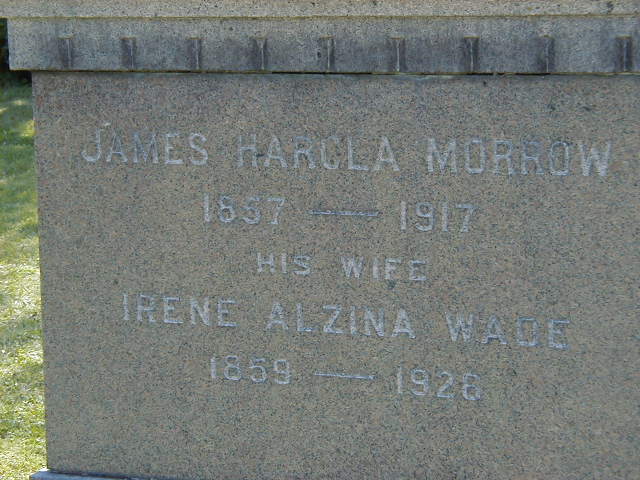 James Harcla Morrow was born on 1 August 1857 at Brighton Twp., Hilton, Northumberland Co., Canada West; Date 1857 per Burial. Date Aug 1857 & location Ont. per 1911 Census. Date Aug 1 1857 & location Ont. rural per 1901 Census. Date 1858 & location Ont. per 1891 Census. Date 1858 & location Ont. per 1881 Census. Date 1857 & location Ont. per 1871 Census. Date 1857 & location UC per 1861 Census. Date 1857 & location Hilton per marr. reg'n.1,7,2,5,3,4,8,6 He appeared on the census of April 1861 at Brighton Twp., Northumberland Co., Canada West; Age 4 at 1861 Census: see Robert J. Morrow.5 He appeared on the census of April 1871 at Brighton Twp., Northumberland Co., Ontario; Age 14 at 1871 Census: see Robert J. Morrow.8 He married Irene Alzina Wade, daughter of William Wade and Amerilla Smith, on 1 August 1877 at Brighton Twp., Northumberland Co., Ontario; Marriage Reg'n.#007695: Groom: James H. Morrow; Age: 20; Res. & Born: Hilton; Status: bachelor; Occ.: farmer; Parents: R. J. & Abigail Morrow; Bride: Irena A. Wade; Age: 18; Res. & Born: Brighton Twp; Status: spinster; Parents: William & Amarilla Wade; Wit.: William & Amarilla Wade, Brighton Twp; Date: Aug 1 1877; Place: Brighton Twp; Rel.: WM & EM; Performed by: Rev. A. Campbell; Reg'r.: A. A. Becker, Brighton Twp. (Ontario Marriage Registration, #007695-1877, ancestry.com) per 1901 Census. per Burial.1,7,9 James Harcla Morrow lived in 1878 at Conc 4 Lot 3 & 4, Brighton Twp., Northumberland Co., Ontario; County Atlas Map: Name: J. H. Morrow; Township: Brighton; County: Northumberland; Date: 1878; Conc & Lot: IV, 3 - 70 & IV, 4 - 30 (County Atlas Map.)10 He appeared on the census of April 1881 at Brighton Twp., Northumberland Co., Ontario; Age 23 at 1881 Census: Morrow, J. H., 23, b. Ont., EM, Irish, General Agent, married; Irena, 22, b. Ont., EM, Eng., married; Oscar, 1 (1881 Census: Brighton Twp., dist. 123, sub-dist. C, pg. 37, line 19 - ancestry.com.)4 He lived on 4 December 1884 at Conc 4 Lot 3, Brighton Twp., Northumberland Co., Ontario; Land Registry Records (Grant 3978) show that James H. Morrow sold part of lot 3, conc 4, Brighton Twp. to Charles W. Johnson for $40. ITS Date: Dec 4 1884. Reg'n. Date: Mar 2 1885 (Land Registry Records, Northumberland Co., Brighton Twp., Conc 4, Lot 3, pg 016 of 346, page copied from OnLand.ca by Dan, Apr 8 2020.)11 He lived on 4 December 1884 at Conc 4 Lot 3, Brighton Twp., Northumberland Co., Ontario; Land Registry Records (Grant 6532) show that James H. Morrow sold part east of Becker St. of lot 3, conc 4, Brighton Twp. to John McQuinn for $40. ITS Date: Dec 4 1884. Reg'n. Date: Feb 24 1899 (Land Registry Records, Northumberland Co., Brighton Twp., Conc 4, Lot 3, pg 017 of 346, page copied from OnLand.ca by Dan, Apr 8 2020.)11 He lived on 5 December 1884 at Conc 4 Lot 4, Brighton Twp., Northumberland Co., Ontario; Land Registry Records (Will 3890) show that the Will of Robert J. Morrow granted "the part lying south & east of the Brighton & Seymour Gravel Road as in Will set forth" to his sons James H. Morrow and Robert A. O. Morrow, from lot 4, conc 4, Brighton Twp. ITS Date: Oct 27 1873. Reg'n. Date: Dec 5 1884 (Land Registry Records, Northumberland Co., Brighton Twp., Conc 4, Lot 4, pg 036 of 346, page copied from OnLand.ca by Dan, Apr 8 2020.)11 He lived on 5 December 1884 at Conc 4 Lot 3, Brighton Twp., Northumberland Co., Ontario; Land Registry Records (Will 3890) show that the Will of Robert J. Morrow granted "the part lying south & east of the Brighton & Seymour Gravel Road as in Will set forth" to his son James H. Morrow and "the part lying west of said road as in will set forth" to his son Robert A. O. Morrow, all from lot 3, conc 4, Brighton Twp. ITS Date: Oct 27 1873. Reg'n. Date: Dec 5 1884 (Land Registry Records, Northumberland Co., Brighton Twp., Conc 4, Lot 3, pg 016 of 346, page copied from OnLand.ca by Dan, Apr 8 2020.)11 He appeared on the census of April 1891 at Brighton, Northumberland Co., Ontario; Age 33 at 1891 Census: Morrow, J. H., 33, b. Ont., p.b. Ireland & Ont., Meth., Agent Man, married; Irena, 31, b. Ont., p.b. Eng. & Ont., Meth., married; Oscar, 12, b. Ont., p.b. Ont; Carrie, 9; Bessie P., 7 (1891 Census: Brighton Village, dist. 98, sub-dist. b-2, pg. 19, line 9 - ancestry.com.)3 He appeared on the census of April 1901 at 12 Young St., Brighton, Northumberland Co., Ontario; Age 43 at 1901 Census: Morrow, James, 43, b. Ont. r. Aug 1 1857, Irish, Meth., Manuf. Agent, married; Irena, 42, b. Ont. r. Jan 29 1857, Eng., M., married; Oscar, 23, b. Aug 12 1877, son; Carrie, 20, b. Nov 9 1881, daughter; Bessie, 18, b. Mar 9 1882, daughter; Wade, 6, b. Nov 7 1894, son (1901 Census Online: Brighton Village, dist. 95, sub-dist. b-1, pg. 4, line 9, T-6485 - 12 Young St.)7 He "23 Prince Edward Street - fire # 58 & 59; October 1903 - 1945 - Morrow Block... October 1903 - 1907 - James H. Morrow; Agent Farm Implements from 19 Prince Edward; 1907 - 1919 - Carriages & Implements - 1904 - 1915 - Ford Motor Co. Dealership - opened a new building at G.T.R. Station Oct 1913 (History of Brighton Business, Susan Brose, 2010, pg. 75) in 1903 at 23 Prince Edward St., Brighton, Northumberland Co., Ontario.12 He lived on 29 July 1903 at Conc 2 Lot 1, Brighton Twp., Northumberland Co., Ontario; Land Registry Records (Grant 7315) show that James H. Morrow & wife & David J. Nesbitt & wife sold 20 acres of lot 1, conc 2, Brighton Twp. to George H. Davidson for $350. ITS Date: Jul 29 1903; Reg'n. Date: Aug 11 1903. (Ontario Land Registry Records, Northumberland Co., Brighton Twp., Conc 2, Lot 1, pg. 009 of 317, image copied from OnLand.ca by Dan 2022 04 11.)11 He appeared on the census of 1911 at 16 Young St., Brighton, Northumberland East Co., Ontario; Age 53 at 1911 Census: Morrow, James H., 53, b. Ont. Aug 1857, Irish, Meth., ?? Agent mfg, married; Irena, 52, b., Ont. Jan 1859, Eng., Meth., married; Oscar L., 31, b. Ont. Aug 1879, Irish, Meth., ?? Agent mfg, son, single; Carrie B., 29, b. Ont. 
