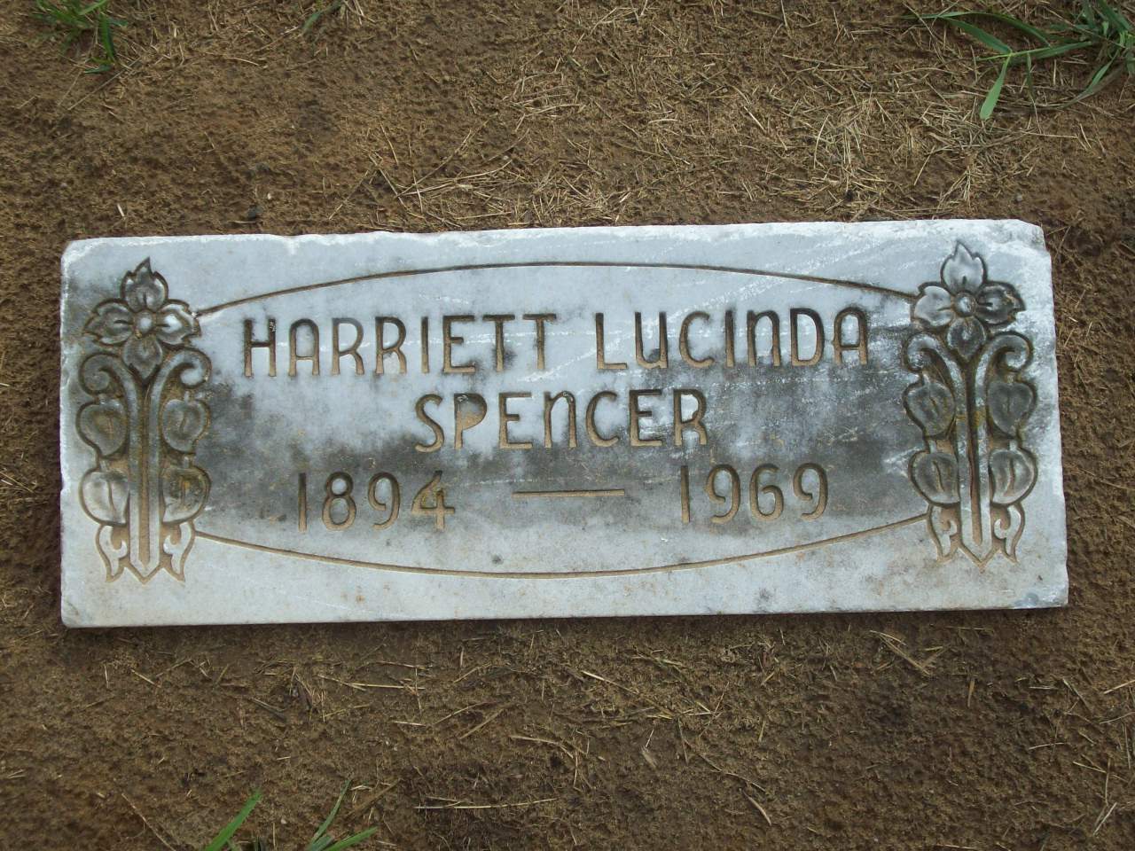 Harriet Lucinda "Hattie" Spencer was born on 5 May 1894 at Brighton Twp., Northumberland Co., Ontario; Date May 5 1894 per 1901 Census.1 She appeared on the census of April 1901 at Brighton Twp., Northumberland Co., Ontario; Age 6 at 1901 Census: see John M. Spencer.1 She was buried in 1969 at McPhail's Cemetery, Brighton Twp., Northumberland Co., Ontario; Memorial: (See Exhibit) Harriett Lucinda; Spencer; 1894 - 1969 (McPhail's Cemetery, Brighton Twp., June 30, 2008.)2 She died in 1969 at Ontario; Date 1969 per Memorial.2