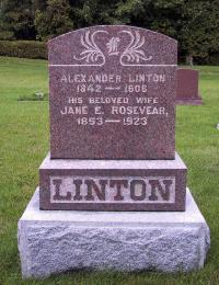 Jane Eliza Rosevear was born on 17 November 1853 at Hamilton Twp., Cold Springs, Northumberland Co., Ontario; Date 1853 per Memorial. Date Nov 17 1852 & location Ont. rural per 1901 Census. per marriage reg'n. of daughter Charlotte Ellen (Linton) Watt. Date Nov 17 1852 & location Cold Springs per email from Barbra Lang Walker, Dec 1 2010.1,3,2,4 She married Alexander Linton, son of William Linton and Elizabeth Chisholm, before 1872 at Hamilton Twp., Northumberland Co., Ontario; Date c. 1872 & location Hamilton Twp. per email from Barbra Lang Walker, Dec 1 2010. per marriage reg'n. of daughter Charlotte Ellen (Linton) Watt.1,2 As of before 1875,her married name was Linton.1 Jane Eliza Rosevear appeared on the census of April 1901 at Hamilton Twp., Northumberland Co., Ontario; Age 48 at 1901 Census: see Alexander Linton.5 She died on 14 May 1923 at Hamilton Twp., Bewdley, Northumberland Co., Ontario, at age 69; Date 1923 per Memorial. Date May 14 1923 & location Bewdley per email from Barbra Lang Walker, Dec 1 2010.2,4 She was buried on 16 May 1923 at Cold Springs Cemetery, Hamilton Twp., Northumberland Co., Ontario; Memorial: (See Exhibit) Alexander Linton; 1842 - 1906; His Beloved Wife; Jane E. Rosevear; 1853 - 1923; LINTON (Cold Springs Cemetery, Hamilton Twp., image taken 2005 - sent to me via email by Barbra Lang Walker, Dec 1 2010. per email from Barbra Lang Walker, Dec 1 2010.2,4