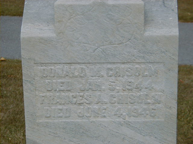 Donald M. Chisholm was born in 1858 at Hastings Co., Ontario; Date 1858 & location Ont. per 1871 Census.1 He appeared on the census of April 1861 at Madoc Twp., Hastings Co., Ontario; Age 2 at 1861 Census: see Henry Chisholm.2 He appeared on the census of April 1871 at Stirling, Hastings Co., Ontario; Age 13 at 1871 Census: see Henry Chisholm.1 He died on 5 January 1944 at Ontario; Date Jan 5 1944 per Memorial & CEMsearch.3,4 He was buried on 7 January 1944 at Stirling Cemetery, Rawdon Twp., Stirling, Hastings Co., Ontario; Memorial: (See Exhibit) Donald M. Chisolm; Died Jan 5, 1944; Frances A. Chisolm; Died June 4, 1946 (Stirling Cemetery, Aug 27, 2005)