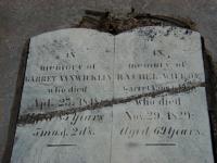 Note: The birth year of John (Jan) is given as 1761 so this militia note referes to the eyar 1781. We might apply this to the other brothers. He married Rachel Frost in 1783 at Rhinebeck RDC, Dutchess Co., New York, U.S.A; per "Migration of Paulus Van Wicklen family to Ontario, Canada", Feb 20, 2006. Garret Van Wicklin lived in 1801 at Conc 8 Lot 12, Cramahe Twp., Northumberland Co., Ontario; "1801 Garrett moved family to Cramahe Twp. and leased Conc 8, Lot 12 in northeast corner of Cramahe Twp." per "Migration of Paulus Van Wicklen family to Ontario, Canada", Feb 20, 2006. He appeared on the census of 1803 at Cramahe Twp., Northumberland Co., Ontario; 1803 Census: Garet Van Weakley; 1 male over 16; 1 female over 16; 6 males under 16; 3 females under 16. He appeared on the census of 1804 at Cramahe Twp., Northumberland Co., Ontario; 1804 Census: Garret Van Wicklen; 3 males over 16; 1 female over 16; 4 males under 16; 4 females under 16. He appeared on the census of 1805 at Cramahe Twp., Northumberland Co., Ontario; 1805 Census: Garret Van Wicklen; 3 males over 16; 2 female over 16; 4 males under 16; 3 females under 16. He appeared on the census of 1806 at Cramahe Twp., Northumberland Co., Ontario; 1806 Census: Garret Van Wicklen; 3 males over 16; 2 female over 16; 4 males under 16; 3 females under 16. He appeared on the census of 1807 at Cramahe Twp., Northumberland Co., Ontario; 1807 Census: Garret Van Wicklen; 3 males over 16; 2 female over 16; 4 males under 16; 3 females under 16. He appeared on the census of 1809 at Cramahe Twp., Northumberland Co., Ontario; 1809 Census: Garret Van Wicklen; 2 males over 16; 1 female over 16; 2 males under 16; 3 females under 16. He appeared on the census of 1810 at Cramahe Twp., Northumberland Co., Ontario; 1810 Census: Garret Van Wicklen; 2 males over 16; 1 female over 16; 3 males under 16; 2 females under 16. He appeared on the census of 1812 at Cramahe Twp., Northumberland Co., Ontario; 1812 Census: Garret Van Wicklen; 2 males over 16; 2 females over 16; 1 male under 16; 2 females under 16; Total 7. He appeared on the census of 1813 at Cramahe Twp., Northumberland Co., Ontario; 1813 Census: Garret Van Wicklen; 2 males over 16; 3 females over 16; 1 male under 16; 1 female under 16; Total 7. He appeared on the census of 1815 at Cramahe Twp., Northumberland Co., Ontario; 1815 Census: Garret Van Wicklin; 3 males over 16; 3 females over 16; 1 female under 16. He appeared on the census of 1816 at Cramahe Twp., Northumberland Co., Ontario; 1816 Census: Garret Van Wicklin; 3 males over 16; 3 females over 16; 1 female under 16. He appeared on the census of 1817 at Cramahe Twp., Northumberland Co., Ontario; 1817 Census: Garret Van Wicklin; 4 males over 16; 2 males under 16; 4 females. He appeared on the census of 1818 at Cramahe Twp., Northumberland Co., Ontario; 1818 Census: Garret Van Wicklin; 4 males over 16; 4 females over 16. He appeared on the census of 1819 at Cramahe Twp., Northumberland Co., Ontario; 1819 Census: Garret Van Wicklin; 4 males over 16; 4 females over 16. He appeared on the census of 1820 at Cramahe Twp., Northumberland Co., Ontario; 1820 Census: Garret Van Wicklin; 4 males over 16; 4 females over 16. He appeared on the census of 1821 at Cramahe Twp., Northumberland Co., Ontario; 1821 Census: Garret Van Wicklin; 4 males over 16; 4 females over 16. He appeared on the census of 1822 at Cramahe Twp., Northumberland Co., Ontario; 1822 Census: Garret Van Wicklin; 3 males over 16; 4 females over 16. He appeared on the census of 1823 at Cramahe Twp., Northumberland Co., Ontario; 1823 Census: Garret Van Wicklin; 3 males over 16; 4 females over 16. He appeared on the census of 1825 at Cramahe Twp., Northumberland Co., Ontario; 1825 Census: Garret Van Wicklin; 3 males over 16; 4? females over 16. He appeared on the census of 1839 at Cramahe Twp., Northumberland Co., Ontario; 1839 Census: Garret Van Wicklin; 1 male under 16; 1 male over 16; 3 females over 16. He died on 23 April 1848 at Cramahe Twp., Northumberland Co., Ontario, at age 85; Date Apr 23 1848 per Burial. per "Migration of Paulus Van Wicklen family to Ontario, Canada", Feb 20, 2006.1 He was buried on 25 April 1848 at Carr Cemetery, Cramahe Twp., Northumberland Co., Ontario; Memorial: (See Exhibit) In; Memory of; Garret VANWICKLIN; Who Died; Apr. 23 1848; Aged 85 Years; 5 mo. & 2 d's (Carr Family Cemetery, Cramahe Twp.)