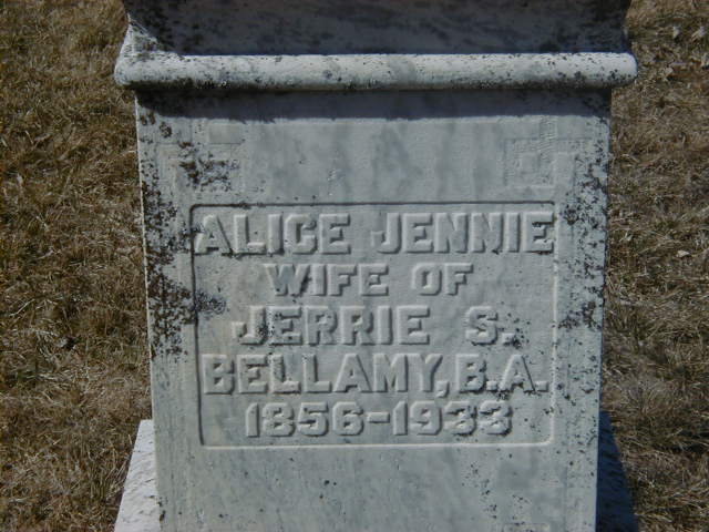 Alice Jennie ? was born in 1856; Date 1856 per Burial.1 As of circa 1878,her married name was Bellamy.1 She married Jeremiah S. Bellamy, son of Chauncey Bellamy and Almira Silver, circa 1878 at Ontario; per Burial.1 Alice Jennie ? was buried in 1933 at Salem Cemetery, Cramahe Twp., Salem, Northumberland Co., Ontario; Memorial: (See Exhibit) Alice Jennie; Wife of; Jerrie S; Bellamy, B.A; 1856 - 1933 (Salem Cemetery, Apr 2, 2006)