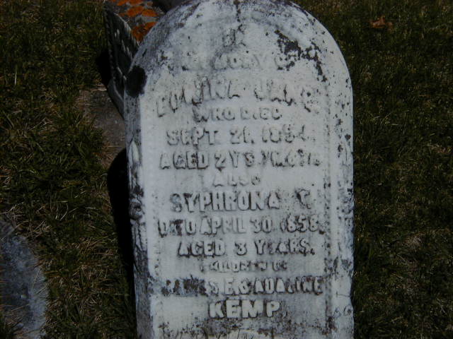 Syphrona T. Kemp was born in 1855 at Percy Twp., Northumberland Co., Canada West; Date 1855 per Memorial & CEMSearch Record. per Kemp GEDCOM sent to me via email by Cheryl Taber, March 14, 2006.1,2,3 She died on 30 April 1858 at Percy Twp., Warkworth, Northumberland Co., Canada West; Date Apr 30 1858 per CEMSearch Record. per Kemp GEDCOM sent to me via email by Cheryl Taber, March 14, 2006.1,2 She was buried on 2 May 1858 at Warkworth Cemetery, Warkworth, Northumberland Co., Canada West; Memorial: (See Exhibit) In; Memory of; Edwina Jane; Who Died; Sep 21, 1854; Aged 2 Y's 1? M's & 1? D; Also; Syphrona T; Who Died; April 30, 1858; Aged 3 Years; Children Of; James E. & Adaline; Kemp (Warkworth Cemetery, Warkworth, Apr. 28, 2007)
