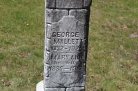 CemSearch: Name: George Mallett; Born: 1832; Died: 1925; Age: 93y; ID: WOODS024; Other names: Mallett, Mary Ann (1835-1917); Cemetery: Woods Cemetery, Conc 1, Lot 12, Cramahe Twp., Northumberland Co., Sec N Row 4 Plot 6; Note: Husband of Mary Ann (https://www.cemsearch.ca/burial/?pID=WOODS024%5E0) Date Apr 22 1925 & location Brighton per Death Reg'n.7,8,9
