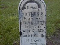 Arthur Stanley Garratt was born on 3 August 1874 at Murray Twp., Northumberland Co., Ontario; per GEDCOM of Don & Jeanne Ross, April 3, 2006.1 He died on 17 September 1874 at Murray Twp., Northumberland Co., Ontario; per GEDCOM of Don & Jeanne Ross, April 3, 2006.1 He was buried on 19 September 1874 at Stockdale Cemetery, Murray Twp., Stockdale, Northumberland Co., Ontario; Memorial: (See Exhibit) Arthur S; Son of; P. T. & M. A. Garrett; Died; Sept 17, 1874; Aged 1 Month; 14 Days (Stockdale Cemetery, May 26, 2006)