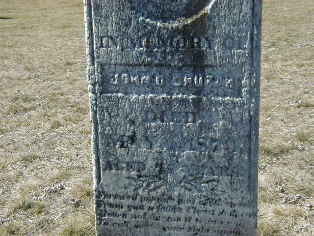 Note: Stone is very old and worn and inscription is unclear - this is best quess for now. One may wonder why a resident of Mount Olivet would be buried way over at McPhail's Cemetery. Actually, seen from Mount Olivet, it may not seem so far away as if we view it from Codrington - it's just south a concession or so. Also, there may have been a religious affiliation at play. James and Mary Ames are also buried at McPhail's. They were CE and not Methodist and likely did not want to be buried in the Wesleyian Methodist cemetery at Mount Olivet. Their children were WM and used the local church.6