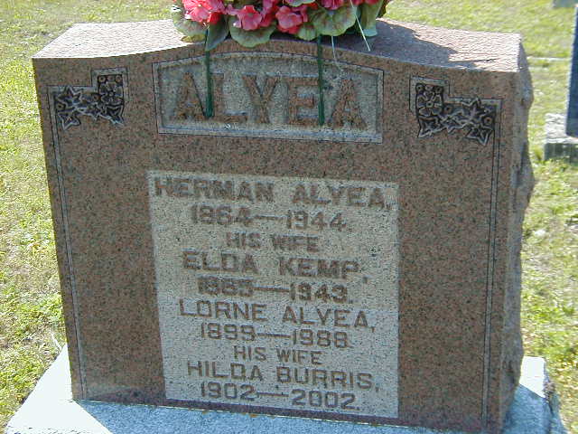 per GEDCOM of David D. Oakerson, May 11, 2006.1,7 Cecil "Lorne" Alyea died in 1988 at Ontario; Date 1988 per Burial.4 He was buried in 1988 at Carrying Place Cemetery, Murray Twp., Carrying Place, Northumberland Co., Ontario; Memorial: (See Exhibit) ALYEA; Herman Alyea; 1864 - 1944; His Wife; Elda Kemp; 1865 - 1943; Lorne Alyea; 1899 - 1988; His Wife; Hilda Burris; 1902 - 2002 (Carrying Place Cemetery, Jue 19, 2006.)4