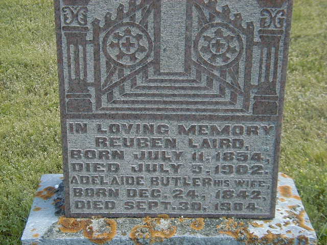 Adelaide L. Butler was born on 24 December 1842 at Murray Twp., Northumberland Co., Canada West; Date Dec 24 1842 per Memorial. Date Dec 24 1840 & location Ont. rural per 1901 Census. Date 1842 & location Ont. per 1871 Census. Date 1841 & location UC per 1861 Census. Date 1840 & location CDa. per 1851 Census. Date Dec 24 1842 per GEDCOM of Kelly Stephenson, June 5, 2006.1,3,2,4,5,6 She appeared on the census of 1852 at Brighton Twp., Northumberland Co., Canada West; Age 11 at 1851 Census: see Miriam Butler.2 She appeared on the census of April 1861 at Brighton, Northumberland Co., Canada West; Age 20 at 1861 Census: see Miriam Butler.3 She appeared on the census of April 1871 at Brighton, Northumberland Co., Ontario; Age 29 at 1871 Census: see Miriam Butler.4 As of 24 February 1877,her married name was Laird.1 She married Rueben David Laird, son of Horatio Nelson Laird and Elizabeth Weller, on 24 February 1877 at Trenton, Hastings Co., Ontario; per GEDCOM of Kelly Stephenson, June 5, 2006.1 Adelaide L. Butler appeared on the census of April 1901 at Sidney Twp., Hastings Co., Ontario; Age 60 at 1901 Census: see Reuben Laird.6 She died on 30 September 1904 at Trenton, Hastings Co., Ontario, at age 61; Date Sep 30 1904 per Memorial. Date Sep 20 1904 per GEDCOM of Kelly Stephenson, June 5, 2006.1,5 She was buried on 2 October 1904 at Carrying Place Cemetery, Murray Twp., Carrying Place, Northumberland Co., Ontario; Memorial: (See Exhibit: In Loving Memory; Reuben Laird; Born July 11, 1854; Died July 5, 1902; Adelaide Butler His Wife; Born Dec. 24, 1842; Died Sep. 30, 1904 (Carrying Place Cemetery, June 10, 2006)