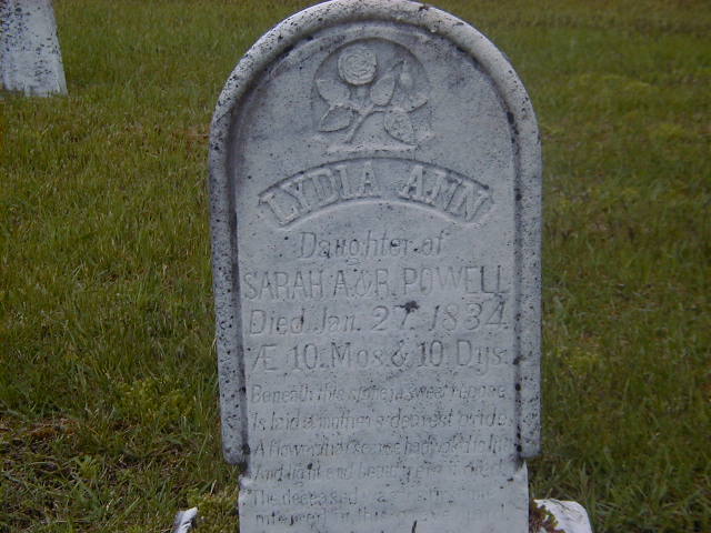 Lydia Ann Powell was born on 17 March 1833 at Murray Twp., Northumberland Co., Ontario; Date Mar 17 1833 per Burial.1 She died on 27 January 1834 at Murray Twp., Northumberland Co., Ontario; Date Jan 27 1834 per Burial.1 She was buried on 29 January 1834 at Stockdale Cemetery, Murray Twp., Stockdale, Northumberland Co., Ontario; Memorial: (See Exhibit) Lydia Ann; Daughter of; Sarah A. & R. Powell; Died Jan 27 1834; Aged 10 Mos & 10 Dys (Stockdale Cemetery, May 26, 2006.)1