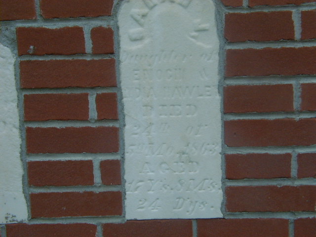 Sarah J. Hawley was born on 30 August 1844 at Ontario; Date Aug 30 1844 per age 18y 8m 24d at death May 24 1863 - per memorial.1 She died on 24 May 1863 at Brighton Twp., Northumberland Co., Ontario, at age 18; Date May 24 1863 per memorial.1 She was buried on 26 May 1863 at Wooler Friends Cemetery, Brighton, Northumberland Co., Ontario; Memorial: (See Exhibit) Sarah J; Daughter of; Enoch &; Lydia Hawley; Died; 24th of; 5th Mo. 1863; Aged; 18 Ys. 8 M's; 24 D'ys. (Wooler Friends Cemetery, Brighton Twp., May 26, 2006.)1