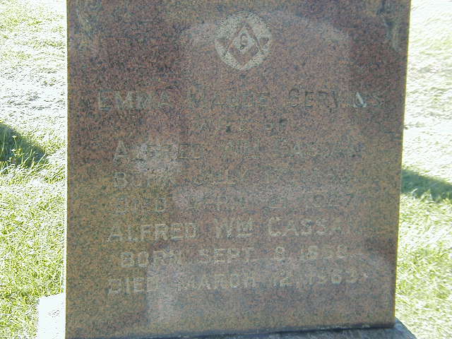 CEMSearch: Name: Alfred William Cassan; Born: 1868-09-08; Died: 1963-03-12; Notes: Husband of Emma Maude Servius, Masonic Emblem; Buried: Christ Church Anglican Church Cemetery, Campbellford, plot 49; Other names: Emmea Maude Cassan (Servius) (1863-1927.)5,6