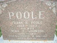 per marriage reg'n. daughter Jennie Viola (Poole) Simpson.8 Francis Burton "Frank" Poole appeared on the census of April 1891 at Brighton Twp., Northumberland Co., Ontario; Age 28 at 1891 Census: Poole, Frank, 28, b. Ont., p.b. Ont. & England, Meth., lab., married; Minnie, 25, b. Ont., p.b. Ont., Meth., married (1891 Census: Brighton Twp., pg. 55, line 17.)7 He appeared on the census of April 1901 at Brighton Twp., Northumberland Co., Ontario; Age 38 at 1901 Census: Poole, Francis B., 38, b. Ont. r. Sep 24 1862, Eng., Meth., Carpenter, married; Mina e., 35, b. Ont. u. Feb 5 1866, Eng., Meth., married; Jennie V., 5, b. Ont. u. Mar 9 1896, daughter (1901 Census Online: Brighton Twp., dist. 95, sub-dist. a-1, pg. 2, line 8, T-6485 - Conc 3, Lot 3, north part.)2 He lived in April 1901 at Conc 3 Lot 3, Brighton Twp., Northumberland Co., Ontario; Residence per 1901 Census: Conc 3, Lot 3, north part, Brighton Twp.2 He lived on 15 June 1907 at Conc 3 Lot 3, Brighton Twp., Cankerville, Northumberland Co., Ontario; Land Registry Records (Grant 8098) show that Margaret W. Richmond & Asher L. Richmond sold "Lots 6 & 7, 2 acres" in lot 3, concession 3, Brighton Twp., Northumberland Co. to Frank Poole for $900. ITS Date: Jun 15 1907. Reg'd. Date: Jul 13 1907. (Ontario Land Registry Records, Northumberland Co., Brighton Twp., Conc 03, pg. 055 of 320, page copied from OnLand.ca by Dan Buchanan, Apr 13 2020.)9 He lived on 20 April 1912 at Conc 3 Lot 3, Brighton Twp., Cankerville, Northumberland Co., Ontario; Land Registry Records (Grant 9054) show that William Wade sold "Lot 10" in lot 3, concession 3, Brighton Twp., Northumberland Co. to Frank Poole for $300. ITS Date: Apr 20 1912. Reg'd. Date: Apr 29 1912. (Ontario Land Registry Records, Northumberland Co., Brighton Twp., Conc 03, pg. 055 of 320, page copied from OnLand.ca by Dan Buchanan, Apr 13 2020.)9 He died on 21 January 1923 at Brighton Twp., Northumberland Co., Ontario, at age 60; Death Reg'n.#024748: Name: Francis Burton Poole; Date: Jan 21 1923; Age: 60y 3m 28d; Res.: Brighton Twp; Born: Cda. Sep 28 1862; Res. at place of Death: 18 yrs; Status: married; Occ.: Carpenter; Parents: John Poole, b. England & Charlotte Williams; Inf.: Geo. Male, Brighton, nephew; Burial: Mt. Hope, Brighton, Jan 23 1923; Cause: tubuculosis; Phys.: F. M. Dunn, Brighton; Reg'r.: Fred O. Wade (Ontario Death Registration, #024748-1923, ancestry.com) Date 1923 per Memorial.10,4 He was buried on 23 January 1923 at Mount Hope Cemetery, Brighton, Northumberland Co., Ontario; Memorial: (See Exhibit) POOLE; Frank B. Poole; 1862 - 1923; His Wife; Mina E. Johnson; 1866 - 1931; Their Son Percy W. Died 1893; Aged 6 Mo. 11 D's (Mount Hope Cemetery, Brighton, June 5, 2009)