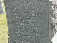 Elizabeth Clapp was born in 1843 at Hillier Twp., Prince Edward Co., Canada West; Date 1843 per Memorial. Date 1844 & location Ont. per 1871 Census. Date 1842 & location Cda. per 1851 Census. Date 1841 & location Hillier per marriage register.1,4,5,3 She appeared on the census of 1851 at Hillier Twp., Prince Edward Co., Canada West; Age 9 at 1851 Census: see Dorland Clapp.3 As of 4 February 1862,her married name was Pettingill.1 She married Melvin Pettingill, son of Allen Pettingill and Elizabeth Martin, on 4 February 1862 at Prince Edward Co., Canada West; Marriage Register: Groom: Melville Pettingill; Age: 21; Res. & born: Hillier; Parents: Allen & Elivra Pettingill; Bride: ???? ; Age: 21; Res. & Born: Hillier; Parents: Joseph & Julia ?? ; Date: 4 Feb 1862; Place: Prince Edward (Ontario Marriage Registers, ancestry.com.)1 Elizabeth Clapp appeared on the census of April 1871 at Murray Twp., Northumberland Co., Ontario; Age 27 at 1871 Census: see Mellville Pettingill.4 She died after 29 August 1874 at Prince Edward Co., Ontario; Date 1874 per Memorial.5 She was buried circa 30 August 1874 at Wellington Cemetery, Wellington, Prince Edward Co., Ontario; Memorial: (See Exhibit) Melvin Pettingill; 1844 - 1916; His Wife; Elizabeth Clapp; 1843 - 1874; Also His Wife; Sarah J. Isteed; 1845 - 1914 (Wellington Cemetery, Wellington, May 28, 2006.)5