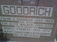 Muriel Frances Goodrich was born in 1923 at Cramahe Twp., Northumberland Co., Ontario; Date 1923 per Memorial. Date 1923 & location Ont. per 1931 Census. per marriage reg'n. of daugher Ida (MacDonald) Goodrich.1,3,2 She appeared on the census of 1 June 1931 at Cramahe Twp., Northumberland Co., Ontario; Age 8 at 1931 Census: see Frank E. Goodrich.2 She lived in 1945 at Brighton, Northumberland Co., Ontario; "81 Goodrich, Frank, farmer, Morganston" & "82 Goodrich, Mrs. Frank - Morganston" & "83 Goodrich, Miss Muriel, spinster, Morganston" per Canada Voter Lists, 1945, Northumberland Co., Cramahe Twp., pg. 84 of 147, ancestry.ca. She lived in 1953 at Brighton, Northumberland Co., Ontario; "96 Goodrich, Frank, lumber dealer, Brighton" & "97 Goodrich, Mrs. Frank E. - Brighton" & 98 Goodrich, Miss Muriel, spinster, Brighton" per Canada Voter Lists, Northumberland Co., Brighton Village, 1953, pg. 58 of 170, ancestry.ca. She lived on 5 October 1957 at 18 Dundas St. (Lot 7), Brighton, Northumberland Co., Ontario; Land Registry Records (Grant 19952) show that Frank E. Goodrich & Eva A. Goodrich granted "part, subject to life lease to Grantor as see deed", Lot 7, Dundas St. North, Brighton Village, Northumberland Co. to Frances M. Goodrich for $1. ITS Date: Oct 5 1957. Reg'n. Date: Jan 20 1958. (Ontario Land Registry Records, Northumberland County, Brighton Village, Book 002, page 287 of 298, OnLand.ca.) She lived in 1958 at Brighton, Northumberland Co., Ontario; "52 Goodrich, Frank, dealer - Brighton" & "53 Goodrich, Mrs. Fran - Brighton" & 54 Goodrich, Miss Muriel, home girl, Brighton" per Canada Voter Lists, Northumberland Co., Brighton Village, 1958, pg. 67 of 187, ancestry.ca. She lived in 1962 at Brighton, Northumberland Co., Ontario; "45 Goodrich, Frank, dealer, Brighton" & "46 Goodrich, Mrs. F., Brighton" & 47 Goodrich, Miss Muriel, spinster, Brighton" per Canada Voter Lists, 1962, Northumberland Co., Brighton Village, pg. 68 of 198, ancestry.ca. She lived in 1965 at Newcastle, Durham Co., Ontario; "105 Goodrich, Miss Murial, rest home, Newcastle" per Canada Voter Lists, 1965, Durham Co., Newcastle Village, pg. 96 of 188, ancestry.ca.4 She died in 1972 at Ontario; Date 1972 per Memorial. per marriage reg'n. of daugher Ida (MacDonald) Goodrich.1,3 She was buried in 1972 at Salem Cemetery, Cramahe Twp., Northumberland Co., Ontario; Memorial: (See Exhibit) GOODRICH; Frank E. Goodrich - 1895 - 1969; His Wife; Eva Alice Walker - 1898 - 1959; Their Daughter; Muriel Frances - 1923 - 1972; Lloyd E. son of Frank E. & Eva Goodrich; Oct. 9, Dec. 13, 1934 (Salem Cemetery, Cramahe Twp., July 6 2009.)3
