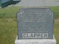 Nelson Clapper was born on 8 April 1862 at Ontario; Date Apr 8 1862 & location Ont. per 1901 Census. per marriage reg'n. of daughter Ruby (Clapper) Cowey. Date 1859 per Memorial.1,2,3 He married Cecellia Bayes, daughter of Solomon Bayes and Mary Tuck, before 1887 at Ontario; per 1901 Census. per marriage reg'n. of daughter Ruby (Clapper) Cowey.1,2 Nelson Clapper appeared on the census of April 1901 at Conc 4 Lot 13, Haldimand Twp., Northumberland Co., Ontario; Residence per 1901 Census: Conc 4, Lot 13, Haldimand Twp.2 He appeared on the census of April 1901 at Haldimand Twp., Northumberland Co., Ontario; Age 38 at 1901 Census: Clapper, Nelson, 38, b. Ont. r. Apr 8 1862, Ger., Chr., farmer, married; Secilia, 40, b. Ont. r. Apr 7 1860, Eng., Chr., married; Ruby, 9, b. May 4 1892, Ger., daughter; Benjamin, 7, b. Jul 30 1893, son; Lewella, 5, b. Oct 3 1895, daughter; Nina, 4, b. Nov 27 1896, daughter; Charlotte P., 1, b. May 8 1899, daughter; Marguerite, - , b. Sep 5 1900, daughter (1901 Census Online: Haldimand, dist 96, subd-sit c-7, pg. 6, line 40, T-6486 - Conc 4, Lot 13.)2 He was buried in 1943 at Eddystone Cemetery, Haldimand Twp., Eddystone, Northumberland Co; Memorial: (See Exhibit) Cecellia Bayes; 1860 -1919; Beloved Wife of; Nelson Clapper; Born 1859 Died 1943; William S; 1888 - 1918; Margaret, 1901 Aged 8 Ms. (Eddystone Cemetery, Haldimand Twp., Jue 9, 2007.)3 He died in 1943 at Ontario; Date 1943 per Memorial.3