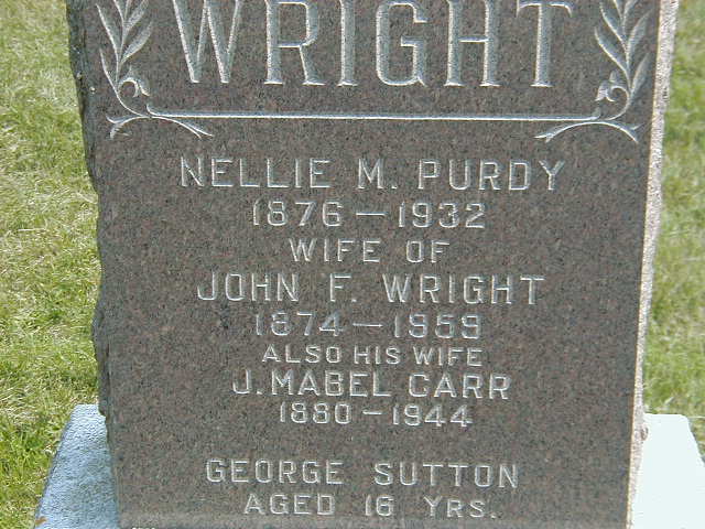 Jessie Mabel Carr was born on 2 February 1880 at Ontario; Date 1880 per Memorial. Date 1880 & location Ont. per CemSearch. Date Feb 2 1881 & location Ont. per Death Reg'n. (Date Calc wrong per Death Reg'n. - should be 64y and not 62.)1,2,3 As of after 1933,her married name was Wright.1 She married John Francis Wright, son of John Robert Wright and Elizabeth Barker, after 1933 at Ontario; 2nd wife of John F. Wright per Memorial & CemSearch.1 Jessie Mabel Carr died on 30 May 1944 at Colborne, Northumberland Co., Ontario, at age 64; Death Reg'n.#033365: Name: Mabel Wright; Date: May 30 1944; Age: 62y 3m 28d; Res.: Victoria St., Colborne; Born: Ont. Feb 2 1881; Status: married; Occ.: housewife; Spouse: John Wright; Parents: John Carr & Ann Jewell, both b. Ont; Inf.: John F. Wright, Colborne, husband; Burial: Shiloh Cemetery, June 1 1944; Und.: E. Quinn, Colborne; Cause: coronary thrombosis; Phys.: A. C. McGlennon, Coroner, Colborne; Reg'd.: Jun 7 1944; Reg'r.: W. W. ... ? (Ontario Death Registration, #033365-1944, ancestry.ca) Date 1944 per Memorial. Date May 30 1944 & location Colborne per CemSearch.1,2,5 She was buried on 2 June 1944 at Shiloh Cemetery, Cramahe Twp., Shiloh, Northumberland Co., Ontario; Memorial: (See Exhibit) WRIGHT; 1876 - 1932; Wife of; John F. Wright; 1874 - 1959; Also His Wife; J. Mabel Carr; 1880 - 1944; George Sutton; Aged 16 Yrs. (Shiloh Cemetery, Shiloh, Cramahe Twp., Sep 4, 2004)