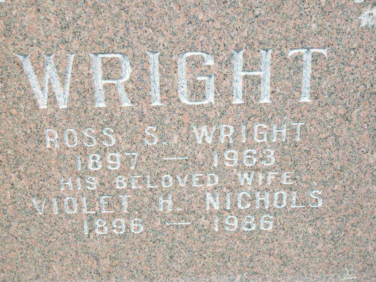 Stanley "Ross" Wright was born on 7 October 1897 at Cramahe Twp., Northumberland Co., Ontario; Birth Reg'n.# : Name: Stanley Ross Wright; Date: Oct 7 1897; Parents: Wm. B. Wright & Josephine McDonald... no pg. 2 ... (Ontario Birth Registration, #... , ancestry.com) Daet 1897 per Memorial. Date Oct 7 1897 & location Ont. rural per 1901 Census. Date 1897 & location Cramahe Twp. per marr. reg'n.1,2,5,4 He appeared on the census of April 1901 at Cramahe Twp., Northumberland Co., Ontario; Age 3 at 1901 Census: see William Wright.1 He lived on 5 March 1918 at Cramahe Twp., Dundonald, Northumberland Co., Ontario; Witness at marriage of Earl Granger Templeton & Arley Gertrdude Nichols.5 He lived on 30 December 1919 at Cramahe Twp., Northumberland Co., Ontario; Residence Cramahe Twp. per marriage reg'n.5 He married Violet Hattie Nichols, daughter of Marshall Benjamin Nichols and Charlotte "Elizabeth" Bray, on 30 December 1919 at Brighton Twp., Hilton, Northumberland Co., Ontario; Marriage Reg'n.#018740(or 710?): Groom: Stanley Ross Wright; Age: 22; Res. & Born: Cramahe Twp; Status: bachelor; Occ.: farmer; Rel.: Meth; Parents: William Wright & Marion McDonald; Bride: Violet Hattie Nichols; Age: 23; Res. & Born: Brighton Twp; Status: spinster; Rel.: Meth; Parents: Marchall Nichols & Elizabeth Bray; Expected Res.: Brighton Twp; Wit.: Myrtle H. Wright & Percy Nichols, RR#2, Colborne; Date: Dec 30 1919; Place: Hilton; Performed by: A. L. Smart, Hilton, Meth; Sworn: Colborne, Dec 23 1919; Reg'r.: H. J. Mayhew (Ontario Marriage Registration, #018740-1919, ancestry.com.)6 Stanley "Ross" Wright was buried in 1963 at Salem Cemetery, Cramahe Twp., Salem, Northumberland Co., Ontario; Memorial: (see Exhibit) WRIGHT; Ross S. Wright; 1897 - 1963; His Beloved Wife; Violet H. Nichols; 1896 - 1986 (Salem Cemetery, Cramahe Twp., July 6 2009, by Dan.)4 He died in 1963 at Ontario; Date 1963 per Memorial.4