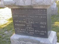 William "Robinson" Young was born in December 1870 at Murray Twp., Northumberland Co., Ontario; Date Nov 5 1872 & location Ont. rural per 1901 Census. Date 1871 & location Ont. per 1881 Census. Date Dec 1870 & location Ont. per 1871 Census.1,2,4 He appeared on the census of April 1871 at Murray Twp., Northumberland Co., Ontario; Age 4 months at 1871 Census: see John Young.4 He appeared on the census of April 1881 at Murray Twp., Northumberland Co., Ontario; Age 10 at 1881 Census: see John Young.2 He appeared on the census of April 1901 at Murray Twp., Northumberland Co., Ontario; Age 28 at 1901 Census: see John Young.1 He married Etta Maud Evans, daughter of George Evans and Catharine McMaster, on 11 January 1905 at Murray Twp., Northumberland Co., Ontario; Marriage Reg'n.#014556: Groom: Wm. R. Young; Age: 33; Res. & Born: Murray; Status; bachelor; Occ.: ?Captain?; Parents: John Young & Catherine Weaver; Bride: Etta Maud Evans; Age: 31; Res. & Born: Murray; Status: spinster; Parents: George Evans & Catherine McMasters; Wit.: G. W. Young, Trenton & Aletha kelley, Milbrook; Date: Jan 11 1905; Place: Murray; Rel.: Pres. & M; Performed by: Rev. A. H. Foster; Reg'd.: Jan 12 1905; Reg'r.: Wm. Little (Ontario Marriage Registration, #014556-1905, ancestry.com) per 1911 Census. per memorial.3,5,6 William "Robinson" Young appeared on the census of 12 April 1911 at Murray Twp., Northumberland Co., Ontario; Age 37 at 1911 Census: see George Evans (father-in-law.)5 He died in 1912 at Ontario; Date 1912 per Memorial.3 He was buried in 1912 at St. George's Cemetery, Trenton, Hastings Co., Ontario; Memorial: (See Exhibit) John Young, 1840 - 1903; His Wife; Catherine, 1840 - 1929; Robinson, 1872 - 1912; His Wife; Etta Maud Evans 1873 - 1945; Howard B., 1886 - 1916 (St. George's Cemetery, Trenton, Sep 24 2005.)3
