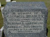 Baldwin Lorenzo Bradley was born on 3 April 1826 at Haldimand Twp., Northumberland Co., Upper Canada; Date 1826 per Memorial. Date 1826 & location Ont. per 1891 Census. Date 1826 & location Ont. per 1871 Census. Date 1826 & location Haldimand UC per 1861 Census. Date 1826 & location Cda. per 1851 Census. Date Apr 3 1826 per GEDCOM of Katie Sweet, May 21, 2007.1,3,4,5,6,7 He married Ruth Emeline Hubble, daughter of Peter Hubble and Clara Guernsey Merriam, on 23 March 1847 at Hastings Co., Ontario; Marriage Register: Groom: ? Bradley; Bride: Ruth Emeline Hubble; Date: 23 March 1847; By Bans; Wit.: Wesley Bradley & Thomas ?Butler? (Ontario Marriage Registers, Marriages by the Rev. Robert Earl, in the office of the Clerk of Peac, Sep 2 1847, Victoria District 1839-1858 - ancestry.com) per 1861 Census. per GEDCOM of Katie Sweet, May 21, 2007.1,5,8 Baldwin Lorenzo Bradley appeared on the census of 1851 at Haldimand Twp., Northumberland Co., Ontario; Age 25 at 1851 Census: Bradley, Lorenzo, 25, b. Cda., Chr., Blacksmith, married; Emaline, 22, b. Cda., Chr., married; Peter W., 4; Romsby, George, 8 (1851 Census: Haldimand Twp., Northumberland Co., pg. 121 of 163, line 23 - ancestry.com.)6 He appeared on the census of April 1861 at St. James Ward, Toronto, York Co., Ontario; Age 35 at 1861 Census: Bradley, B. ?(m) , 35, b. Haldimand, UC, Christian Conference, Medical Student, married; R. E.(f), 32, b. Rawdon, UC, Chr., married; Wesley, 13, b. Haldimand UC, son; ?W. A.?(f), 9; A.(f), 6; Newel(m), 3; E. C.(f), 2 (1861 Census: Toronto, York Co., St. James Ward, Dist. 6, pg. 499 of 751, line 1 - ancestry.com.)5 He appeared on the census of April 1871 at Woodstock, Oxford North Co., Ontario; Age 45 at 1891 Census: Bradley, Baldwin, 45, b. Ont., Irish, WM, Physician, married; Ruth, 42, b. Ont., - , WM, married; ?Annetta?(f), 15; Newell, 13; Clarindice?(f), 11 (1871 Census: Woodstock, Oxford North Co., pg. 89, line 11 - ancestry.com.)4 He lived in 1875 at Dundas St., Woodstock, Oxford Co., Ontario; "Bradley, Baldwin, L. M. D., physician and surgeon, Dundas St." Oxford Co. Directory, 1874-1875, pg. 97 (56 of 107) - ancestry.com.9 He appeared on the census of April 1891 at Woodstock, Oxford North Co., Ontario; Age 65 at 1891 Census: Bradley, Baldwin L., 65, b. Ont., p.b. US, Meth., Physician, married; Ruth E., 61, b. Ont., p.b. US, Meth., married; Dawson, Blanche, 20, b. US, p.b. US, Meth., GR?, single (1891 Census: Woodstock, Oxford North Co., dist. 107, sub-dist. 7-4, pg. 39, line 22 - ancestry.com.)3 He was buried in 1897 at Eddystone Cemetery, Haldimand Twp., Northumberland Co., Ontario; Memorial: (See Exhibit) In Memory of; Baldwin L. Bradley; 1826 - 1897; Deborah A. aged 2 weeks; Garibaldi, aged 5 weeks; Children of B.L. and Ruth E; Bradley (Eddystone Cemetery, Haldimand Twp., Jun 9 2007.)7 He died in 1897 at Ontario; Date 1897 per Memorial. Date 1897 per GEDCOM of Katie Sweet, May 21, 2007 & per family tree of tylerERIKA2 on ancestry.com, Feb 4 2014.1,2,7