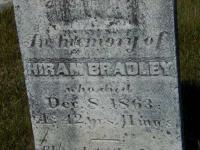 Hiram Bradley was born in January 1821 at Haldimand Twp., Northumberland Co., Upper Canada; Date Jan 1821 per Memorial - age 42y 11m at death Dec c8 1863. Date 1820 per GEDCOM of Katie Sweet, May 21, 2007.1,2 He died on 8 December 1863 at Northumberland Co., Canada West, at age 42; Date Dec 8 1863 per Memorial. Date Dec 8 1863 & location Northumberland Co. per GEDCOM of Katie Sweet, May 21, 2007.1,2 He was buried on 10 December 1863 at Eddystone Cemetery, Haldimand Twp., Northumberland Co., Canada West; Memorial: (See Exhibit) In Memory of; Hiram Bradley; Who Died; Dec. 8, 1863; Age 42 Yr's, 11 Mo's (Eddystone Cemetery, Haldimand Twp., Northumberland Co., Jul 9 2007) per GEDCOM of Katie Sweet, May 21, 2007.1,2