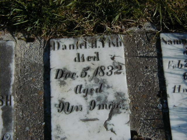 Note: Placing this child with Ebenezer since we know he was here at the time - is this correct??1 He died on 5 December 1832 at Haldimand Twp., Northumberland Co., Ontario, at age 9; Date Dec 5 1832 per Memorial.1 He was buried on 7 December 1832 at Academy Hill Cemetery, Haldimand Twp., Northumberland Co., Ontario; Memorial: (See Exhibit) Daniel H. Fish; Died; Dec. 5. 1832; Aged; 9 Yr. 9 Mos (Academy Hill Cemetery, Haldimand Twp., Apr 28 2007.)1