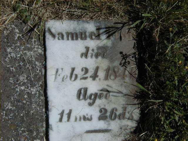 Samuel Fish was born on 1 March 1845 at Haldimand Twp., Northumberland Co., Canada West; Dae Mar 1 1845 per Memorial - age 11m 26d at death Feb 24 1846.1 He died on 24 February 1846 at Haldimand Twp., Northumberland Co., Canada West; Date Feb 24 1846 per Memorial.1 He was buried on 26 February 1846 at Acacdemy Hill Cemetery, Haldimand Twp., Northumberland Co., Canada West; Memorial: (See Exhibit) Samuel Fish; died; Feb 24 1846; Aged; 11 m's 26 d's (Academy Hill Cemetery, Haldimand Twp., Apr 28, 2007 & June 8, 2007.)1