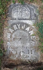 Mary Jane Fish was born in 1845 at Cramahe Twp., Northumberland Co., Canada West; Date 1845 & location Brighton per GEDCOM of Joseph Shaw, June 9, 2007.1 She appeared on the census of April 1861 at Brighton Twp., Northumberland Co., Canada West; Age 17 at 1861 Census: see William Fish.2 She died on 27 February 1867 at Brighton Twp., Northumberland Co., Canada West; Date Feb 27 1867 per CemSearch. Date after Apr 1861 - she is in 1861 Census. Date 1861 per GEDCOM of Joseph Shaw, June 9, 2007.1,2,3 She was buried on 28 February 1867 at Waite Cemetery, Cramahe Twp., Northumberland Co., Canada West; Memorial: (See Exhibit) Mary Jane; Daughter of; William & Berentha; Fish; Died; Feb 27 1867... (Waite Cemetery, Cramahe Twp., Aug 8 2018)