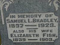 Elizabeth Fish was born in 1839 at New York, U.S.A; Date 1839 & location New York State per 1861 Census. Date 1839 per GEDCOM of Robert Young, June 10, 2007.1,2 As of circa 1860,her married name was Bradley.1 She married Samuel Lemuel Bradley, son of Abraham Harnden Bradley and Ruth Tucker, circa 1860 at Haldimand Twp., Eddystone, Northumberland Co., Canada West; Samuel and Elizabeth are married per 1861 Census. per GEDCOM of Robert Young, June 10, 2007.1,2 Elizabeth Fish appeared on the census of April 1861 at Haldimand Twp., Northumberland Co., Canada West; Age 22 at 1861 Census: see Abraham H. Bradley (father-in-law.)2 She lived on 26 June 1873 at Haldimand Twp., Northumberland Co., Ontario; Witness at marriage of Abraham Harnden Bradley & Sarah (Tucker) Bradley - she had been wife of Sylvanus Bradley.3 She was buried in 1903 at Eddystone Cemetery, Haldimand Twp., Eddystone, Northumberland Co., Ontario; Memorial: (See Exhibit) In Memory of; Samuel L. Bradley; 1837 - 1923; Also His Wife; Elizabeth Fish; 1839 - 1903 (Eddystone Cemetery, Haldimand Twp., June 9, 2007.)4 She died in 1903 at Ontario; Date 1903 per Memorial.4 She lived on 7 September 1923 at Haldimand Twp., Grafton, Northumberland Co., Ontario; Informant for Death Reg'n. of husband Samuel Bradley.5