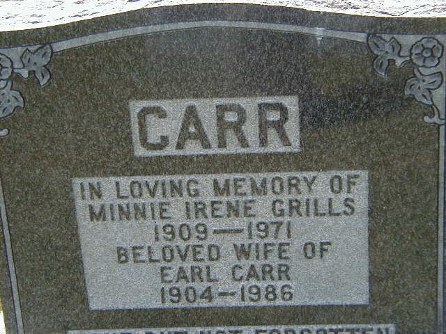 Earl Carr was born on 24 August 1904 at Percy Twp., Northumberland Co., Ontario; Late Birth Reg'n.#502793: Name: Earl Carr; Date: Aug 24 1904; Parents: Herman Carr & Hannah Madis, both b. Brighton Twp; Inf.: Earl Carr; Reg'd.: Nov 19 1969, Whitby Ontario Late Birth Registration, #502793-1904, ancestry.com.)2 He married Minnie Irene Grills, daughter of Alfred John Grills and Jennie Edmondson, circa 1930; per Memorial.3 Earl Carr was buried in 1986 at Warkworth Cemetery, Warkworth, Northumberland Co., Ontario; Memorial: (See Exhibit) CARR; In Loving Memory of; Minnie Irene Grills; 1909 - 1971; Beloved Wife of; Earl Grills; 1904 - 1986 (Warkworth Cemetery, Warkworth, Apr. 28, 2007.)3 He died in 1986; Date 1986 per Memorial.