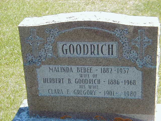 CemSearch: Name: Melinda A. Goodrich; Maiden: Bebee; Born: Jun 12 1883; Died: Apr 4 1937; Age: 52y 2n 23d; ID: WRKWTH0126; Other names: Goodrich, Anna Elizabeth Brock [Alford] (1869-1928), Goodrich, Clara E. [Gregory] (1901-1980), Goodrich, Emma [Stewart] (1855-1932), Goodrich, James Hannon (1862- ), Goodrich, Herbert Bales (1886-1968), Goodrich, William (1851-1947), Goodrich, William M. (1912-1999); Cemetery: Warkworth Cemetery, Conc 3, Lot 15, Percy Twp., Village of Warkworth, Northumberland Co., Sec 2 Row S Plot 24; Note: Died Percy Twp. Daughter of Guy Marshal Bebee and Elsie Garrison. Married Sept. 24, 1908 in Abinger Twp. to Herbert B. Goodrich. Survived by daughters Mrs. Burnet harnden of Colborne, Mrs. Malcom Yule of Cramahe Twp. and Miss Emma Goodrich at home and sons William of Red lake Mining District and Clare and Roy at home. Info from marriage reg & death reg. (https://www.cemsearch.ca/burial/?pID=WRKWTH0126%5E0.)1,9