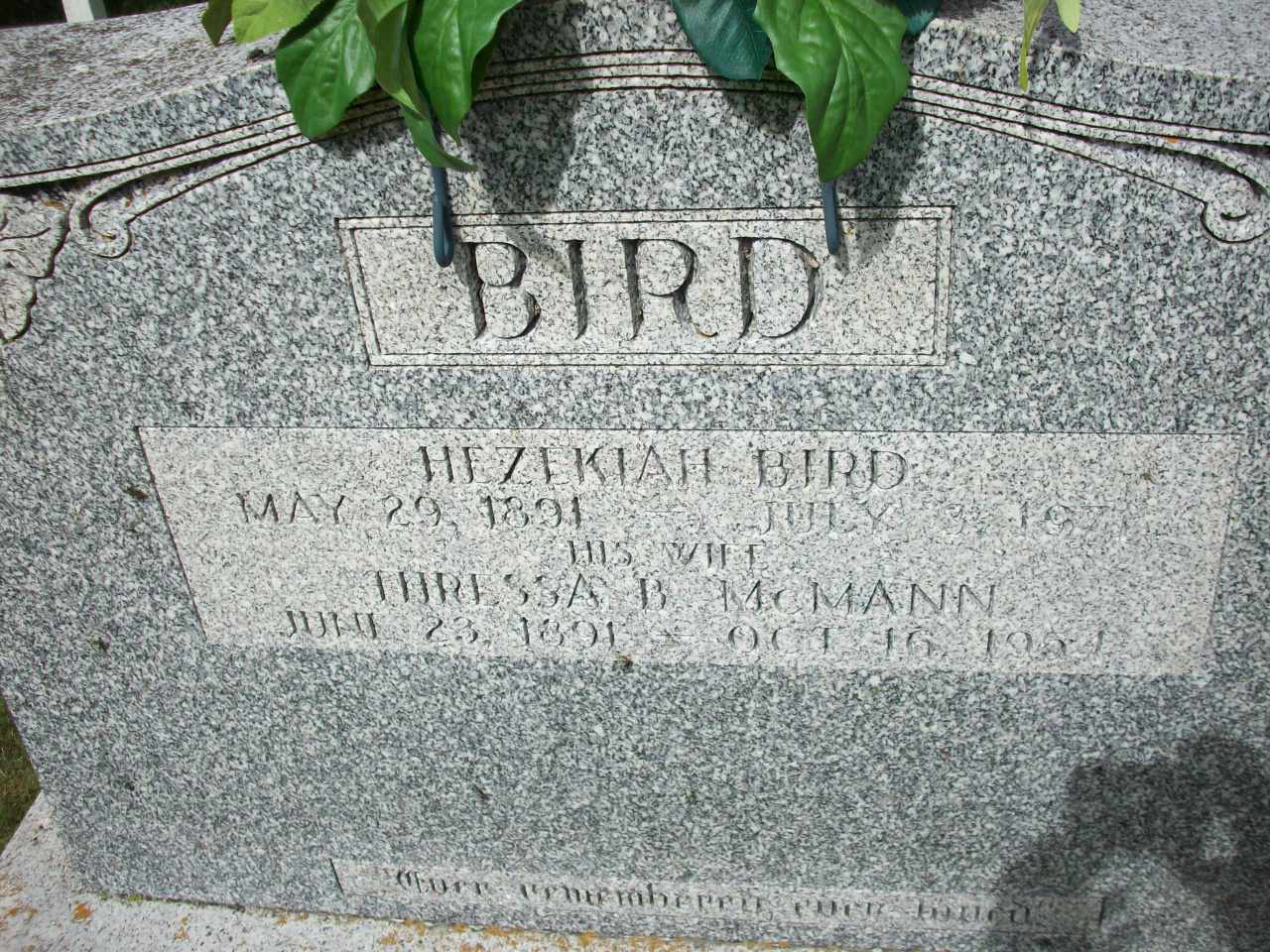 per GEDCOM of Gareld R. McEathron, June 26, 2007.1,4 Hezekia "Kire" Bird died on 3 July 1971 at Cramahe Twp., Northumberland Co., Ontario, at age 80; per GEDCOM of Gareld R. McEathron, June 26, 2007.1 He was buried on 6 July 1971 at Stones Cemetery, Percy Twp., Northumberland Co., Ontario; Memorial: (See Exhibit) BIRD; Hezekiah Bird; May 29, 1891 - July 3, 1971; His Wife; Thressa B. McMann; July 23, 1891 - Oct. 16, 1954 (Stones Cemetery, Percy Twp., July 15, 2009.)3