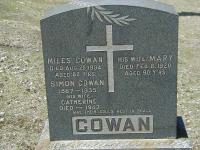 Note: Stange. Dates are way off here?? Printing is very clear.6 He appeared on the census of April 1901 at Brighton Twp., Northumberland Co., Ontario; Age 80 at 1901 Census: Cowan, Miles, 80, b. Ireland Sep 15 1820, immig. '48, Irish, RC, farmer, married; Mary, 69, b. Ireland 1831, immig. '48, Irish, RC, married; Simon, 37, b. Ont. r. Jan 19 1863, Irish, RC, farmer, single (1901 Census: Brighton Twp., Northumberland Co., dist. 95, sub-dist. a-4, pg. 1, line 32 - ancestry.com.)4 He died on 28 August 1904 at Brighton Twp., Northumberland Co., Ontario, at age 83; Date Aug 28 1904 per Memorial.7 He was buried on 30 August 1904 at Roman Catholic Cemetery, Brighton Twp., Codrington, Northumberland Co; Memorial: (See Exhibit) Miles Cowan; Died Aug 28, 1904; Aged 82 Y'rs; His Wife Mary; Died Feb. 8, 1920; Aged 90 Y'rs; Simon Cowan; 1867-1935; His Wife; Catheerine; Died 1943; COWAN (Roman Catholic Cemetery, Codrington, Brighton Twp.)7
