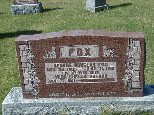Location Brighton Twp. per Death Notice.1,2 He "Operators were Al Dunn who was replaced in 1933 by Doug and Vera Fox. Mr. & Mrs. Dunn had been there for 6 years." per story of telephone office in Orland - from The Tweedsmuir Histories of Codrington, copied from microfilm at The Metro Toronto Reference Library, Nov. 2007. in 1933 at Brighton Twp., Orland, Northumberland Co., Ontario.2 He married Vera Luella Arthur, daughter of Henry Clayton "Harry" Arthur and Elizabeth "Libbie" Murray, on 11 May 1933 at Murray Twp., Wooler, Northumberland Co., Ontario; Date May 11 1933 & location Wooler per family tree of LindaSmithUE on ancestry.com, Jan 5 2013. Married per story re Orland Telephone office which Doug and Vera took over in 1933. per Memorial.3,2,4 George Douglas Fox Charles Buchanan told me that he recalls being upstairs in his room at William Goodfellows place when Lloyd and Louise Ames and Doug and Vera Fox came to visit. Charles was the hired man for Bill Goodfellow at that time and would later marry Mary Ames. He says he had trouble sleeping due to the loud noises coming from downstairs well into the night; there apperantly was a lot of laughter from these three friendly couples. (Charles Buchanan to Dan Buchanan, Dec 2007) circa 1947 at Northumberland Co., Ontario.5 He died on 21 June 1981 at Trenton Memorial Hospital, Trenton, Hastings Co., Ontario, at age 75; "George Douglas Fox; George Douglas Fox, RR 1, Codrington, passed away suddenly in Trenton Memorial Hospital June 22 in his 76th year. He was born in Brighton Township, the son of the late James and Annie Fox, and is survived by his widow Vera (Arthur). Mr. Fox is also survived by children Gerald, Frankfordl Allan, Wooler and David, RR 1, Codrington; and by six grandchildren. He was predeceased by a brother Elwood Fox. He operated a bus for 25 years before his retirement. He was educated in Brighton Schools, and was a member of the United Church. ... June 24 .. Interment was in Friends Cemetery, Brighton Township." per the Death Notice of George Douglas Fox from The Tweedsmuir Histories of Codrington, copied at The Metro Toronto Reference Library, Nov 2007.