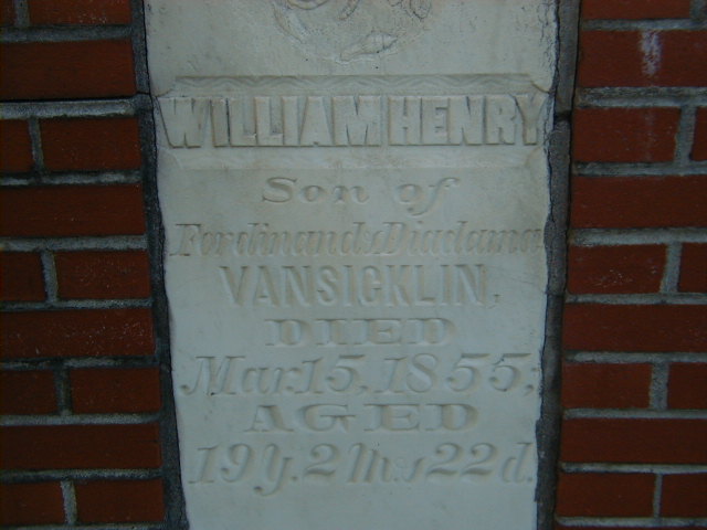 William Henry Vansicklen was born on 21 December 1835 at Murray Twp., Northumberland Co., Upper Canada; Date Dec 21 1835 per Memorial - age 19y 2m 22d at death Mar 15 1855. Date 1834 & location Cda. per 1851 Census.1,2 He appeared on the census of March 1852 at B righton Twp., Northumberland Co., Ontario; Age 17 at 1851 Census: see Ferdinand Vansicklen.2 He died on 15 March 1855 at Brighton Twp., Northumberland Co., Canada West, at age 19; Date Mar 15 1855 per Memorial.1 He was buried on 17 March 1855 at Vansicklen Cemetery, Brighton Twp., Boes Road, Northumberland Co., Canada West; Memorial: (See Exhibit) William Henry; son of; Ferdinand & Diadama; Vansicklin; Died; Mar 15, 1855; Aged; 19y 2m 22d (Vansicklen Cemetery, Boes Road, Brighton Twp., Sep 23 2005.)1
