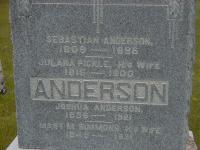 Sebatian Anderson was born on 8 October 1809 at Murray Twp., Northumberland Co., Upper Canada; Date 1809 per Memorial. Date Oct 8 1809 & location Murray Twp. per Death Reg'n. - age 77y 1m 14d at death Nov 22 1886. Date 1809 & location Ont. per 1881 Census. Date 1810 & location Ont. per 1871 Census. Date 1808 & location Cda. per 1851 Census. Date Oct 1809 & location Murray per GEDCOM of Robert Graham, June 29, 2009. per marriage reg'n. of son Justice Melville Anderson.1,2,3,4,5,6 He appeared on the census of 1832 at Conc 9 Lot 3, Murray Twp., Northumberland Co., Upper Canada; 1832 Assessment: Sabastian Anderson; 40 acres uncult; 10 acres cult; NE pt. 1/2 Lot 3, Conc 9; 1 male over 16; 1 male under 16. He appeared on the census of 1833 at Conc 8 Lot 3, Murray Twp., Northumberland Co., Upper Canada; 1833 Assessment: Sabastian Anderson; 88 acres uncult; 12 acres cult; E pt. Lot 3, Conc 8; 1 male over 16. He appeared on the census of 1834 at Conc 8 Lot 3, Murray Twp., Northumberland Co., Upper Canada; 1834 Assessment: Sabastian Anderson; 80 acres uncult; 20 acres cult; E 1/2 Lot 3, Conc 8; 1 male over 16; Total 1. He married Julianna Susan Pickle in 1834 at Northumberland Co., Upper Canada; Date 1834 & location Ont. per GEDCOM of Robert Graham, June 29, 2009. per marriage reg'n. of son Justice Melville Anderson.1,7 Sebatian Anderson appeared on the census of 1835 at Conc 8 Lot 3, Murray Twp., Northumberland Co., Upper Canada; 1835 Assessment: Sabastian Anderson; 80 acres uncult; 20 acres cult; E 1/2 Lot 3, Conc 8; 1 male over 16; Total 1. He appeared on the census of 1836 at Conc 8 Lot 3, Murray Twp., Northumberland Co., Upper Canada; 1836 Assessment: Sabastian Anderson; 85 acres uncult; 25 acres cult; E 1/2 Lot 3, Conc 8; 1 male over 16; 1 female over 16; 1 female under 16; Total 3. He appeared on the census of 1837 at Conc 8 Lot 3, Murray Twp., Northumberland Co., Upper Canada; 1837 Census: Sabastian Anderson; 70 acres uncult; 30 acres cult; North 1/2 Lot 3, Conc 8; 1 male over 16; 1 male under 16; 1 female over 16; 1 female under 16; Total 4 (Just under Thomas Anderson.) He appeared on the census of 1837 at Conc 8 Lot 3, Murray Twp., Northumberland Co., Upper Canada; 1837 Assessment: Sabastian Anderson; 70 acres uncult; 30 acres cult; North 1/2 Lot 3, Conc 8; 1 male over 16; 1 male under 16; 1 female over 16; 1 female under 16; Total 4. He appeared on the census of 1838 at Conc 8 Lot 3, Murray Twp., Northumberland Co., Upper Canada; 1838 Assessment: Sabastian Anderson; 80 acres uncult; 20 acres cult; North 1/2 Lot 3, Conc 8; 1 male over 16; 1 male under 16; 1 female over 16; Total 3. He appeared on the census of 1839 at Conc 8 Lot 3, Murray Twp., Northumberland Co., Upper Canada; 1839 Assessment: Sabastian Anderson; 76 acres uncult; 24 acres cult; North 1/2 Lot 3, Conc 8. He appeared on the census of 1839 at Murray Twp., Northumberland Co., Upper Canada; 1839 Census: Sabastian Anderson; 1 male over 16; 2 males under 16; 1 female over 16; 1 female under 16. He appeared on the census of 1840 at Murray Twp., Northumberland Co., Upper Canada; 1840 Census: Sabastian Anderson; 2 males under16; 1 male over 16; 1 female over 16. He appeared on the census of 1841 at Murray Twp., Northumberland Co., Canada West; 1841 Census: Sabastian Anderson; 2 males over 16; 2 males under 16; 2 females over 16. He appeared on the census of 1848 at Murray Twp., Northumberland Co., Canada West; 1848 Census: Sabastian Anderson; Lot 3, Conc 8, prop; farmer. He appeared on the census of 1850 at Con 8 Lot 3, Murray Twp., Northumberland Co., Canada West; 1850 Census: Sabastian Anderson; Lot 3, Conc 8, prop; 7 persons. He appeared on the census of 1852 at Murray Twp., Northumberland Co., Canada West; Age 43 at 1851 Census: Anderson, Sebastian, 43, c. Cda., WM, farmer, married; Julian, 38, b. Cda., WM, married; Joshua, 16; Thomas, 14; Ezra, 9; Laura, 6; Charles, 4; Hannah, 1 (1851 Census: Murray Twp., Northumberland Co., pg. 110 of 172, line 32 - ancestry.ca.)2 He appeared on the census of April 1871 at Marysburgh Twp., Prince Edward Co., Ontario; Age 61 at 1871 Census: see Joshua Anderson (son.)6 He appeared on the census of April 1881 at Sydney Twp., Hastings West Co., Ontario; Age 72 at 1881 Census: see Joshua Anderson (son.)5 He died on 22 November 1886 at Conc 6, Sidney Twp., Hastings Co., Ontario, at age 77; Death Reg'n.#006997: Sebastian Anderson; Date: Nov 22 1886; Age: 77y 1m 14d; Born: Murray Twp; Cause: inflammation kidney, 5 days; Phys.: Dr. S. Rockwell; Inf.: Charles Anderson, Conc 6, Sidney, B. A?; Reg'd.: Nov 22 1886; Rel.: Meth; Reg'r.: F. B. Prior, Sidney Twp. (Ontario Death Registration, #006997-1886, ancestry.ca)(Given name was mis-trascribed as Robertson and not Sebastian) Date 1886 per Memorial. Date Nov 22 1886 & location Ont. per GEDCOM of Robert Graham, June 29, 2009.7,8,4 He was buried on 24 November 1886 at Stockdale Cemetery, Stockdale, Northumberland Co., Ontario; Memorial: (See Exhibit) Sebastian Anderson; 1809 - 1886; Julana Pickle, His Wife; 1815 - 1900; ANDERSON; Joshua Anderson; 1836 - 1921; Mary M. Simmons, His Wife; 1849 - 1921 (Stockdale Cemetery, Stockdale, May 26 2006.)4