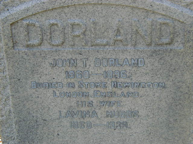 Lavina Hubbs was born on 31 August 1860 at Hallowel Twp., Prince Edward Co., Ontario; Date Aug 31 1860 & location Ont. rural per 1901 Census. Date Aug 31 1860 & location Hallowell per GEDCOM of Elizabeth Archer, Mar 2 2008. Date 1860 per Memorial.1,2,3 As of 29 December 1881,her married name was Dorland.1 She married John Trumpour Dorland, son of John Trumpour Dorland and Mary Ann Garratt, on 29 December 1881 at Ontario; per GEDCOM of Elizabeth Archer, Mar 2 2008.1 Lavina Hubbs appeared on the census of April 1901 at Hallowell Twp., Prince Edward Co., Ontario; Age 40 at 1901 Census: see Margaret Jones (mother.)2 She died on 18 May 1939 at Wellington, Prince Edward Co., Ontario, at age 78; per GEDCOM of Elizabeth Archer, Mar 2 2008.1 She was buried on 20 May 1939 at Wellington Cemetery, Wellington, Prince Edward Co., Ontario; Memorial: (See Exhibit) DORLAND; John T. Dorland; 1860 - 1896; Buried in Stoke, Newington; London, England; His Wife; Lavina Hubbs; 1860 - 1939 (Wellington Cemetery, Wellington, May 28 2006.)3