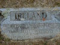 Richard Fletcher Ireland was born on 27 August 1858 at Murray Twp., Northumberland Co., Ontario; Date 1858 per Memorial. Date Aug 27 1858 & location Ont. rural per 1901 Census. Date 1860 & locaiton Ont. per 1871 Census. Date 1858 & location UC per 1861 Census.1,3,4,5 He appeared on the census of April 1861 at Murray Twp., Northumberland Co., Ontario; Age 3 at 1861 Census: see Maria E. Ireland (mother.)1 He appeared on the census of April 1871 at Murray Twp., Northumberland Co., Ontario; Age 11 at 1871 Census: see Maria Ireland (mother.)4 He lived on 9 September 1893 at Conc B Lot 21, Murray Twp., Northumberland Co., Ontario; Land Registry Records (Grant 5189) show that John Rankin sold 20 acres "all that part of the east half lying east and south of the travelled road .. excepting part occupied by Mount Carmel Burying Ground" of lot 21, conc B, Murray Twp. to Robert F. Ireland. ITS Date: Sep 9 1893. Reg'n. Date: Sep 11 1893. (Ontario Land Registry Records, Northumberland Co., Murray Twp., Conc B, Lot 21, Book 003, pg. 220 of 261, pg 02, copied from OnLand.ca by Dan Nov 22 2020.)6 He married Emma Bell Huff, daughter of Alger Hurlburt Huff and Victoria Kingsley, on 22 December 1897 at Ameliasburgh Twp., Huff's Island, Prince Edward Co., Ontario; Marriage Reg'n.#012616: Groom: Richard F. Ireland; Age: 39; Res. & Born: Smithfield; Status: bachelor; Occ.: farmer; Parents: R. Ireland & M. Waldron; Bride: E. Bell Huff; Age: 24; Res. & Born: Huff's Island; Status: spinster; Parents: Alger Huff & Victoria Kingsley; Wit.: M. C. & Annie Huff, Huff's Island; Date: Dec 22 1897; Place: Huff's Island; Rel.: Meth; Performed by: Rev. J. Moran (Ontario Marriage Registration, #012616-1897, ancestry.com.)2,7 Richard Fletcher Ireland lived in April 1901 at Conc 2, Lot 20, Murray Twp., Northumberland Co., Ontario; Residence at 1901 Census: Conc 2, Lot 20, Murray Twp.3 He appeared on the census of April 1901 at Murray Twp., Northumberland Co., Ontario; Age 42 at 1901 Census: Ireland, Richard, 42, b. Ont. r. Aug 27 1858, Eng., Meth., farmer, married; Bell, 27, b. Ont. r. Jul 23 1873, Ger., Meth., married; Evertte, 2, b. Ont. r. May 29 1898, Eng., son; Maria, 74, b. Ont. r. Jun 22 1826, Eng., Meth., mother, widow (1901 Census Online: Murray Twp., dist. 95, sub-dist. g-2, pg. 3, line 19, T-6485 - Conc 2, Lot 20.)3 He died in 1932 at Ontario; Date 1932 & location Ont. per GEDCOM of Dick Oke, May 25, 2008.2 He was buried in 1932 at Greenwood Cemetery, Smithfield, Northumberland Co., Ontario; Memorial: (See Exhibit) IRELAND; Richard E. - 1858 - 1943; His Wife; Emma Belle - 1875 - 1955; Their Son; Everett C. - 1899 - 19?? (Greenwood Cemetery, Smithfield, June 5, 2005.)5