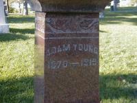 Adam Young was born on 4 May 1870 at Murray Twp., Northumberland Co., Ontario; Date 1870 per Memorial. Date 1870 & location Ont. per Death Reg'n. Date 1870 & location Ont. per 1911 Census. Date May 4 1870 & location Ont. rural per 1901 Census. Date 1870 & location Ont. per 1891 Census. Date 1870 & location Ont. per 1881 Census. Date 1870 & location Murray per marr. reg'n.1,2,3,4,5,6,7 He appeared on the census of April 1881 at Murray Twp., Northumberland Co., Ontario; Age 11 at 1881 Census: see Robert Young.1 He appeared on the census of 6 April 1891 at Murray Twp., Northumberland East Co., Ontario; Age 21 at 1891 Census: see Robert Young.4 He married Etta Louisa Ireland, daughter of James Michael Ireland and Rebecca Miller, on 26 October 1897 at Murray Twp., Northumberland Co., Ontario; Marriage Reg'n.#010718: Groom: Adam Young; Age: 27; Res. & Born: Murray; Status: bachelor; Occ.: farmer; Parents: Robert Young & Margaret Smith; Bride: Etta Louisa Ireland; Age: 27; Res. & Born: Murray; Status: spinster; Parents: James Ireland & Rebecca Muller; Wit.: Frank Young, Murry & Sylvia M. Ireland, Trenton; Date: Oct 26 1897; Place: Murray; Rel.: Pres. & Meth; Performed by: John Garratt; Reg'd.: Dec 11 1897; Reg'r.: T. R. Garratt (Ontario Marriage Registration, #010718-1897, ancestry.com.)8 Adam Young lived in April 1901 at Conc A Lot 10, Murray Twp., Northumberland Co., Ontario; Residence per 1901 Census: Conc A, lot 10, Murray Twp.3 He appeared on the census of April 1901 at Murray Twp., Northumberland Co., Ontario; Age 30 at 1901 Census: Young, Adam, 30, b. Ont. r. May 4 1870, Scot., Pres., farmer, married; Margaret, 59, b. Ont. r. Nov 1 1841, Scot., Pres., mother, widow; Adam, 66, b. Ont. r. Aug 17 1844, Scot., Pres., retired farmer, single; Ann, 50, b. Ont. r. Oct 9 1849, Scot., Pres., aunt, single; Etta, 29, b. Ont. r. Dec 30 1871, Eng., Meth., married; Rebecca, 2, b. Ont. r. Aug 17 1898, Scot., Meth., daughter; Maggie, 24, b. Ont. r. May 28 1876, Scot., Pres., sister, single (1901 Census Online: Murray Twp., dist. 95, sub-dist. g-2, pg. 7, line 50, T-6485 - Conc A, Lot 10.)3 He appeared on the census of 12 June 1911 at Murray Twp., Northumberland East Co., Ontario; Age 41 at 1911 Census: Young, Adam, Jr., 41, b. Ont. May 1870, Scot, Pres., farmer, married; Margaret A., 69, b. Ont. Nov 1834?, Eng., Pres., mother, widow; Rebecca, 12, b. Ont. Aug 1898, Scot., Pres., dau; Adam Sr., 81, b. Quebec Sep 1830, Scot., Pres., uncle, single; Ann, 57, b. Ont. Apr 1854, Scot., Pres., aunt, single; Corbett, Michael, 60, b. Ont., June 1840, Irish, R.C., farm lab., servant, single (1911 Census: Murray Twp., Northumberland East Co., dist. 101, sub-dist. 23-2, (101-12), pg. 10, line 42 - ancestry.ca.)5 He "Her father, Adam Young was born May 4, 1870. My limited knowledge is that he died sometime in 1919 a few days after being taken to Toronto General Hospital following a cattle stampede at Brighton's railway station. His remains were brought back to Trenton for burial @ St George's. The story I got from cousin Rebecca (Reba) was that her dad Adam & another man had taken livestock to board the train destined for the Toronto Stockyards. A passing (likely off-schedule) train's noises startled the cattle & they stampeded. Adam was stretchered & put into a boxcar to get him to Toronto as fast as possible." per email from Ann McMaster, July 23 2018.