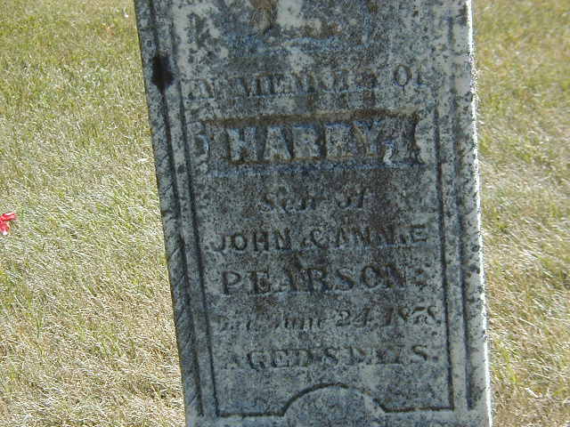 Harry Pearson was born on 15 January 1878 at Brighton Twp., Northumberland Co., Ontario; Date Jan 15 1878 per Memorial.1 He died on 24 January 1878 at Brighton Twp., Northumberland Co., Ontario; Date Jan 24 1878 per Memorial.1 He was buried on 26 January 1878 at Stone's Cemetery, Percy Twp., Northumberland Co., Ontario; Memorial: (See Exhibit) In Memory of; Harry; son of; John & Annie; Pearson; Died Jan 24, 1878; Aged 8 Days (Stone's Cemetery, Percy Twp., June 25 2007.)1