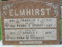 CEMSearch: Name: Franklin G. Elmhirst; Born: 1898; Died: 1988; Buried: Maple Grove Cemetery, Belmont Twp., Conc 10, Lot 4, Hwy 30 sout of 7, Sec B Row 5; Other names: Donald F. Elmhirst (1922- ), Dora M. Elmhirst (Youmans) (1925- ), Pearl E. Elmhirst (Spinks) (1900-1987.)3,4 He died in 1988 at Ontario; Date 1988 per Memorial & CEMSearch.3,4