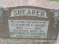 Elizabeth Florence Sharp was born in 1886 at Aspodel Twp., Peterborough Co., Ontario; Date 1886 per Memorial. Date 1886 & location Asphodel Twp. per marr. reg'n.1,2 As of 5 January 1916,her married name was Shearer.1 She married Archibald Shearer, son of Thomas Shearer and Jane Hope, on 5 January 1916 at Asphodel Twp., Westwood, Peterborough Co., Ontario; Marriage Reg'n.#?? : Groom: Archie Shearer; Age: 32; Res. & Born: Otonabee; Status: bachelor; Occ.: farmer; Rel.: Pres; Parents: Thomas Shearer & Jane Hope; Bride: E. Florence Sharp; Age: 30; Res.: Westwood; Born: Asphodel; Status: spinster; Rel.: Pres; Parents: William Sharp & Eliza McNeil; Wit.: Wm. G. Shearer, Birdsall & Louise J. Scott, Norwood; Date: Jan 5 1916; Place: Westwood; Performed by: R. McEachern, Keene, Pres; Sworn: Peterboro, Dec 2?, 1915; Reg'n.: Roy Hutchinson (Ontario Marriage Registration, #? , ancestry.com.)1 Elizabeth Florence Sharp was buried in 1967 at Westwood Community Cemetery, Asphodel Twp., Westwood, Peterborough Co., Ontario; Memorial: (See Exhibit) SHEARER; In Loving Memory of; Elizabeth F. Sharp; 1885 - 1967; Beloved Wife of; Archibald Shearer; 1883 - 1974 (Westwood Community Cemetery, Westwood, Sep 2 2008.)2 She died in 1967 at Ontario; Memorial: (See Exhibit) SHEARER; In Loving Memory of; Elizabeth F. Sharp; 1885 - 1967; Beloved Wife of; Archibald Shearer; 1883 - 1974 (Westwood Community Cemetery, Westwood, Sep 2 2008.)2