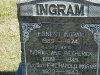 CEMSearch: Name: Nora Jane Ingram; Maiden: Petherick; Born: 1889; Died: 1949; Notes: Wife of Ernest, buried Sep 2 1949; Buried: Brunbrae Cemetery, Seymour Twp., Plot 426; Other names: Eric Harold Ingram (1920-1943), Ernest Ingram (1885-1974) per Alexander Ingram GEDCOM file sent to my by Lorraine (Ingram) Wager, Nov 17, 2008.3,4,5