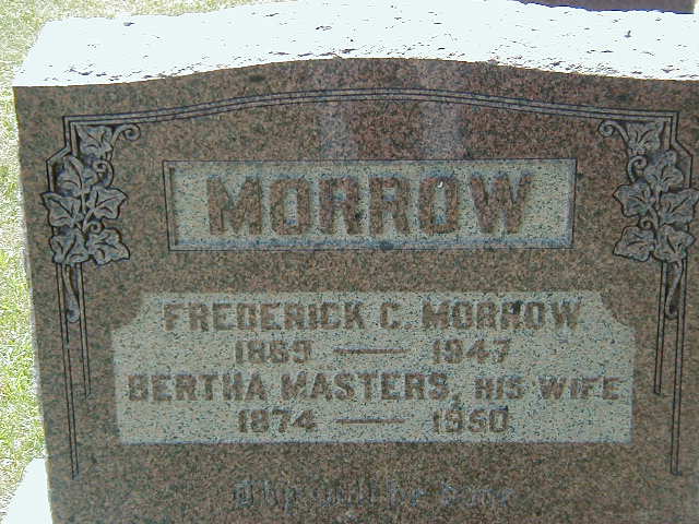 Frederick C. "Joseph" Morrow was born on 18 January 1869 at Cramahe Twp., Northumberland Co., Ontario; Date Jan 1869 & location Ont. per 1911 Census. Date Jan 18 1869 & location Ont. rural per 1901 Census. Date 1869 & location Ont. per 1881 Census. Date 1869 & location Ont. per 1871 Census. Date 1869 &location Cramahe Twp. per marr. reg'n. Date 1869 per GEDCOM of Paul Enge., Dec 31 2008.1,5,2,4,6,7 He appeared on the census of April 1871 at Cramahe Twp., Northumberland Co., Ontario; Age 2 at 1871 Census: see Alexander Morrow.5 He appeared on the census of April 1881 at Colborne, Northumberland Co., Ontario; Age 12 at 1881 Census: see Alexander Morrow.7 He lived on 4 February 1891 at Colborne, Northumberland Co., Ontario; Residence Colborne per marr. reg'n.4 He married Bertha Masters, daughter of Ira Franklin Masters and Mary Asenath Merriam, on 4 February 1891 at Colborne, Northumberland Co., Ontario; Marriage Reg'n.#008535: Groom: Joseph Marrow; Age: 22; Res.: Colborne; Born: Cramahe Twp; Status: bachelor; Occ.: lab; Parents: Alex & Helen Marrow; Bride: Bertha Masters; Age: 18; Res.: Colborne; Born: Haldimand Twp; Status: spinster; Parents: Ira & May Masters; Wit.: Amir Brintnell & Jemir Robinson, Colborne; Date: Feb 4 1819; Place: Colborne; Rel.: Meth. & Bapt; Performed by: Rev. P. Duncan (Ontario Marriage Registration, #008535-1819, ancestry.com) per GEDCOM of Paul Enge., Dec 31 2008.1,8 Frederick C. "Joseph" Morrow appeared on the census of April 1901 at 192 Parliament St., Colborne, Northumberland Co., Ontario; Age 32 at 1901 Census: Morrow, Fred C., 32, b. Ont. r. Jan 18 1869, Eng., Bapt., Fruit Exporter, married; Bertha, 26, b. Ont. r. May 25 1874, Eng., Bapt., married; Archie, 8, b. Ont. u. Apr 1 1893, son; Francis, 5, b. Ont. u. Jul 31 1895, son (1901 Census Online: Colborne Village, dist. 95, sub-dist. d-2, pg. 2, line 27, T-6485 - 192 Parliament St.)6 He appeared on the census of 1911 at Colborne, Northumberland Co., Ontario; Age 42 at 1911 Census: Morrow, F. C., 42, b. Ont. Jan 1869, Eng., Bapt., farmer, married; Bertha, 37, b. Ont., Eng., Bapt., married; Arsha(?) A., 17; Masters, Mary, 62, b. Ont. Mch 1849, Eng., Bapt., Mother, widow; Morrow, Alex, 72, b. Ireland Jul 1839, immig. 1859, Eng., CE, retired farmer, father married; Ellen, 71, b. Ont. Jan 1840, Eng., Bapt., mother, married; Harnes, Jane, 80, b. Ont. Aug 1831, Eng., Bapt., sister-in-law, single (1911 Census Online: Colborne, dist. 101, sub-dist. c, pg. 3, line 3 - King St.)2 He lived on 18 August 1928 at Colborne, Northumberland Co., Ontario; Informant for Death Reg'n. of his father Alexander Morrow.9 He died in 1947 at Ontario; Date 1947 per Memorial. Date 1947 per GEDCOM of Paul Enge., Dec 31 2008.1,3 He was buried in 1947 at East Colborne Cemetery, Colborne, Northumberland Co., Ontario; Memorial: (See Exhibit) MORROW; Frederick C. Morrow; 1869 - 1947; Bertha Masters, His Wife; 1874 - 1950 (East Colborne Cemetery, Jun 5 2005)