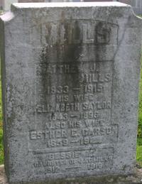 CemSearch: Name: Matthew J. Mills; Born: 1833; Died: 1915; Age: - ; ID: MTHOPE183; Other names: Mills, Bessie M. (1912-1916), Mills, Esther E., [Carson] (1859- ), Mills, Elizabeth [Saylor] (1843-1896); Cemetery: Mount Hope Cemetery, Conc A, Lot 35, Brighton Twp., Village of Brighton, Northumberland Co., Sec 1 Row 10; Note: Husband of Elizabeth Saylor and Esther E. Carson. (https://www.cemsearch.ca/burial/?pID=MTHOPE183%5E0) Date of Death Oct 11 1915 & location of Burial Mount Hope Cemetery, Brighton per Death Reg'n.6,4,5